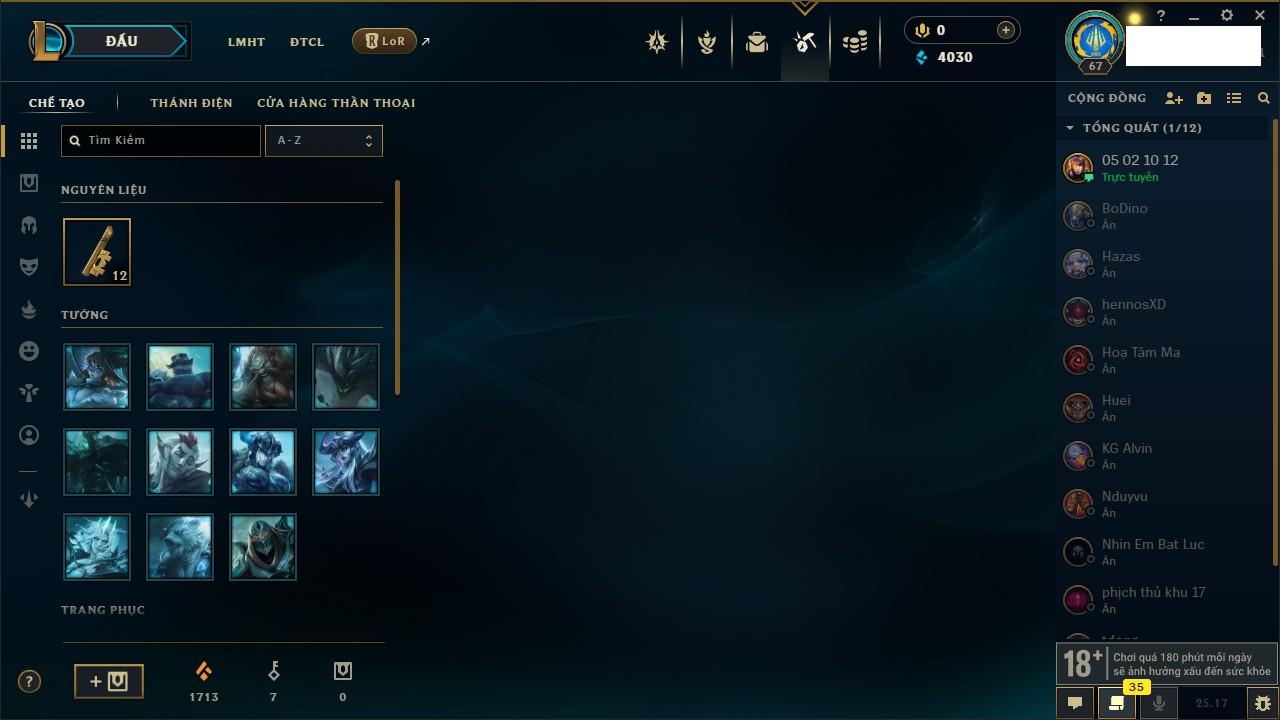 Rank Đơn: Chưa RankKhung: Chưa có khungTướng: 169 - Còn 43188 THXTrang Phục: 205Rank ĐTCL: Chưa RankLinh Thú: 259