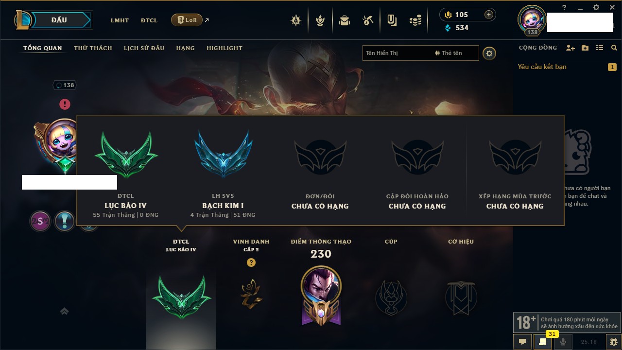 Rank Đơn: Vàng IVKhung: VàngTướng: 146 - Còn 89110 THXTrang Phục: 63Rank ĐTCL: Vàng IIILinh Thú: 41