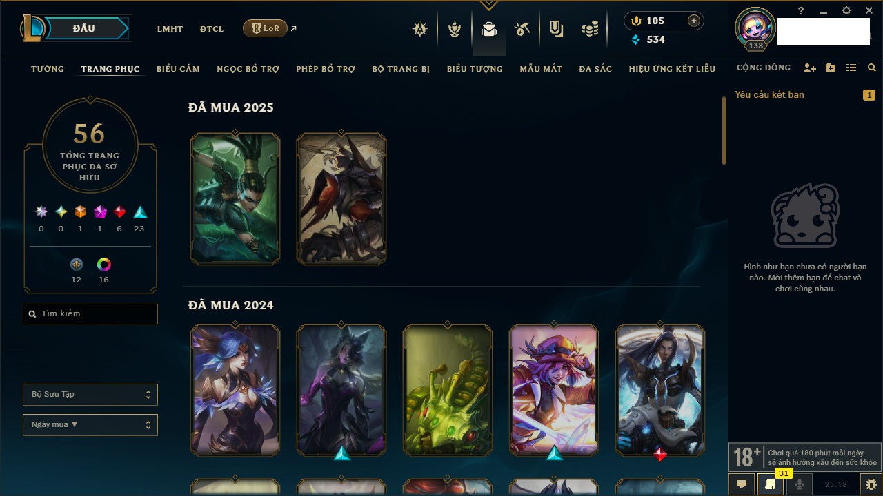 Rank Đơn: Đồng IIKhung: Chưa có khungTướng: 170 - Còn 56487 THXTrang Phục: 90Rank ĐTCL: Chưa RankLinh Thú: 129