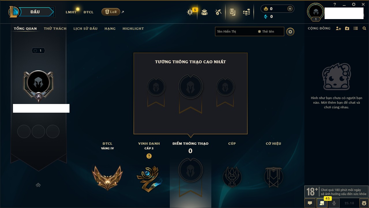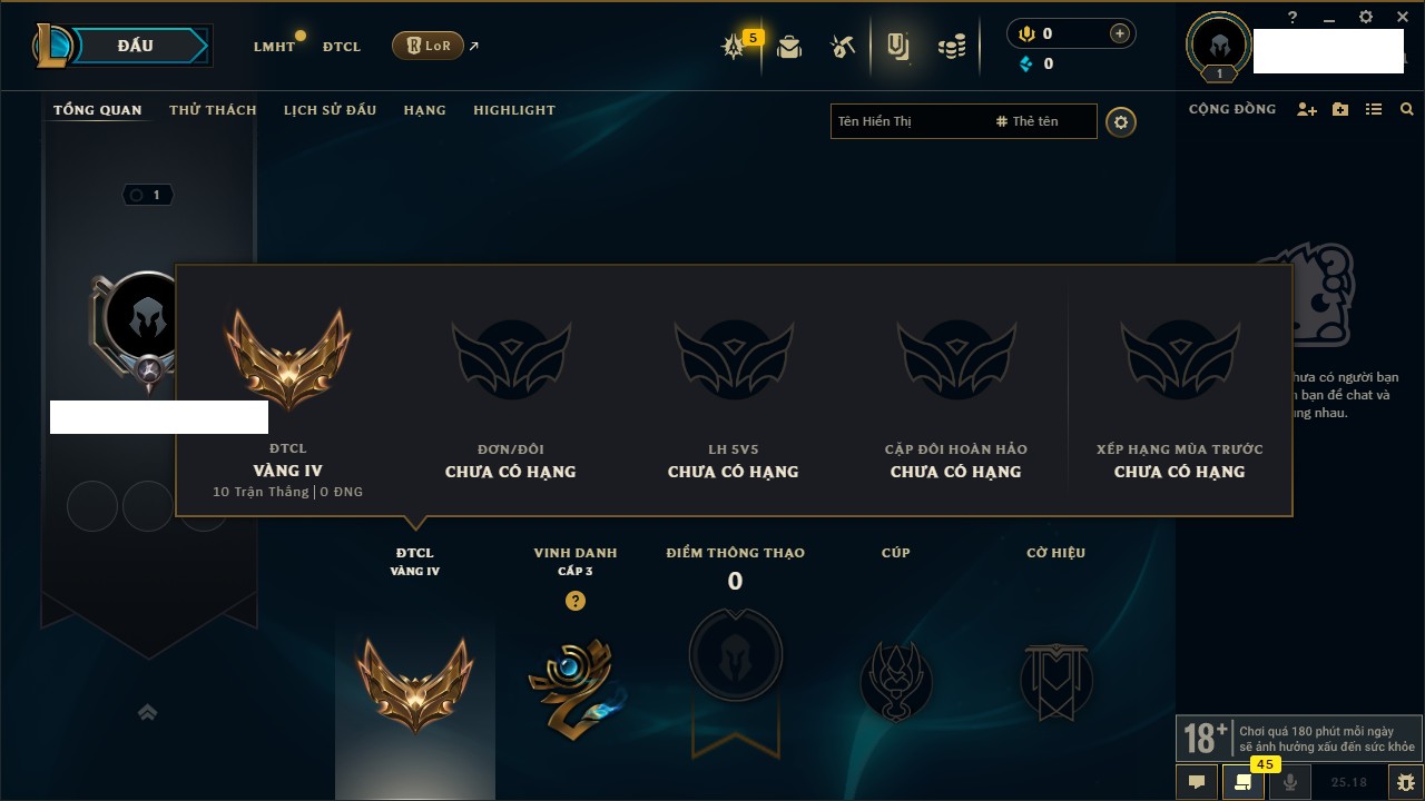 Rank Đơn: Chưa rank mùa nàoKhung: Chưa có khungTướng: 0 - Còn 0 THXTrang Phục: 0Rank ĐTCL: Chưa RankLinh Thú: 4