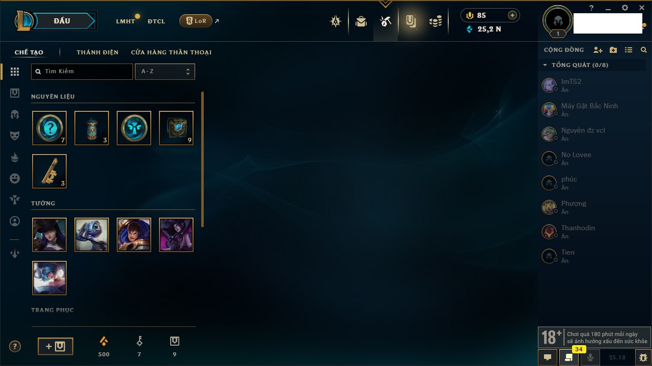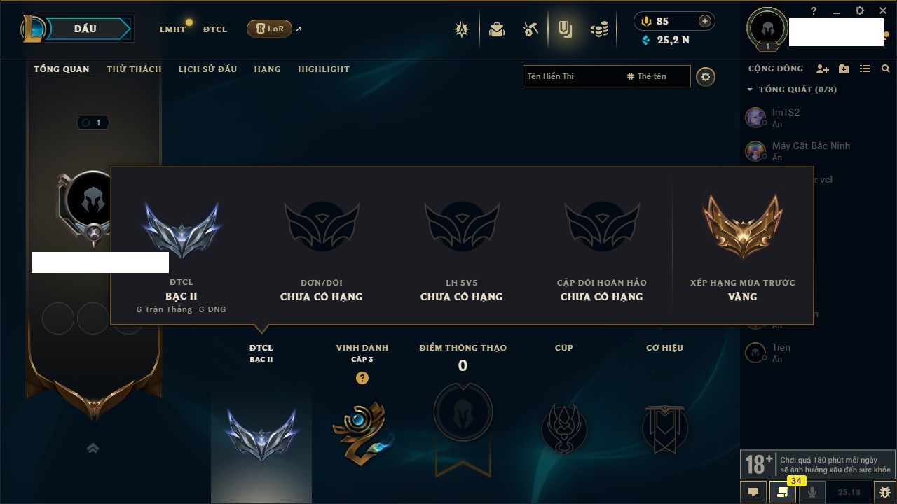 Rank Đơn: Vàng IIIKhung: BạcTướng: 171 - Còn 101359 THXTrang Phục: 88Rank ĐTCL: Kim Cương IVLinh Thú: 200