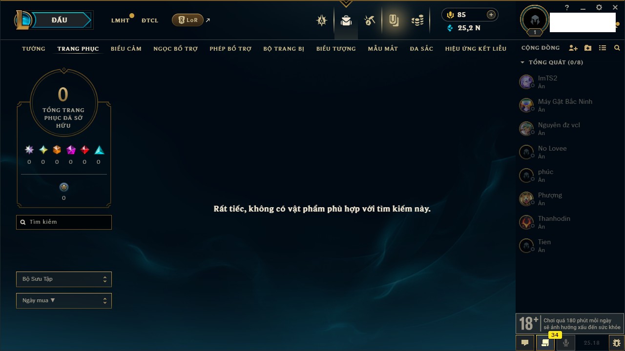 Rank Đơn: Đồng IKhung: ĐồngTướng: 168 - Còn 11447 THXTrang Phục: 245Rank ĐTCL: Chưa RankLinh Thú: 53
