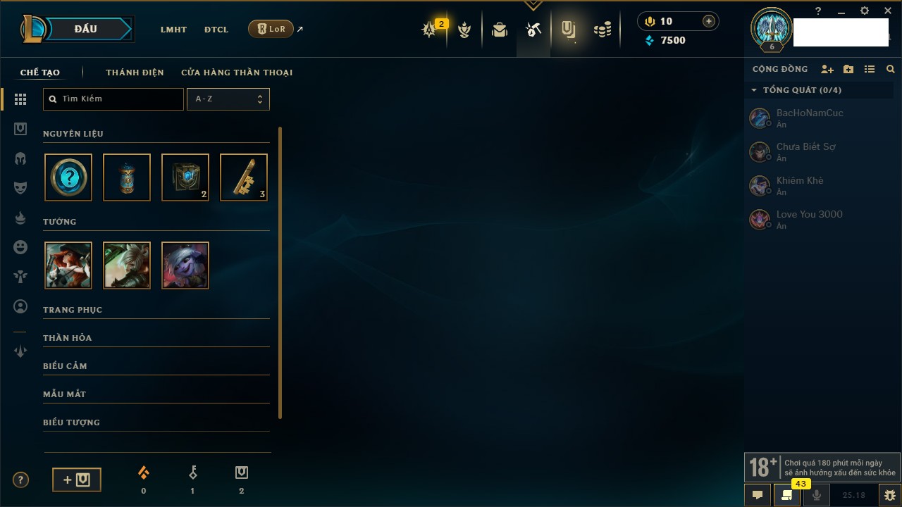 Rank Đơn: Chưa rank mùa nàoKhung: Chưa có khungTướng: 0 - Còn 6300 THXTrang Phục: 0Rank ĐTCL: Bạc IIILinh Thú: 3