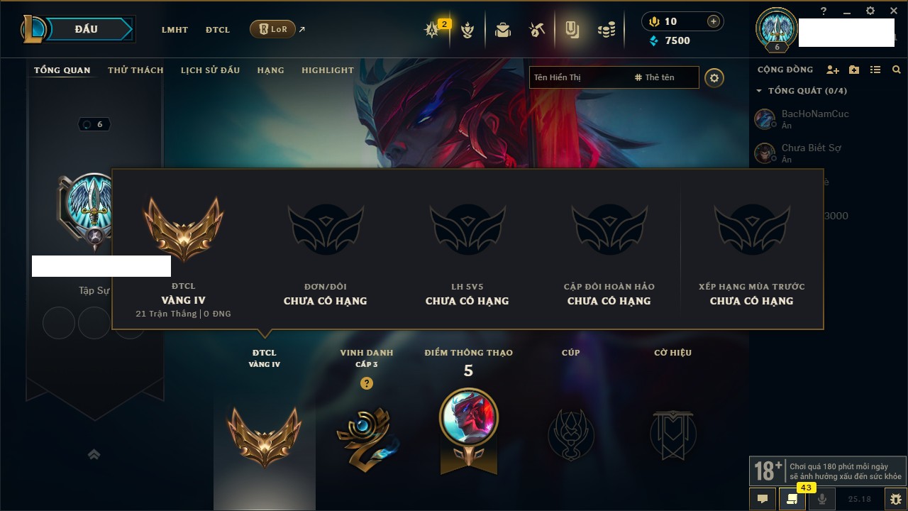 Rank Đơn: Chưa rank mùa nàoKhung: Chưa có khungTướng: 7 - Còn 24800 THXTrang Phục: 0Rank ĐTCL: Bạch Kim IVLinh Thú: 19