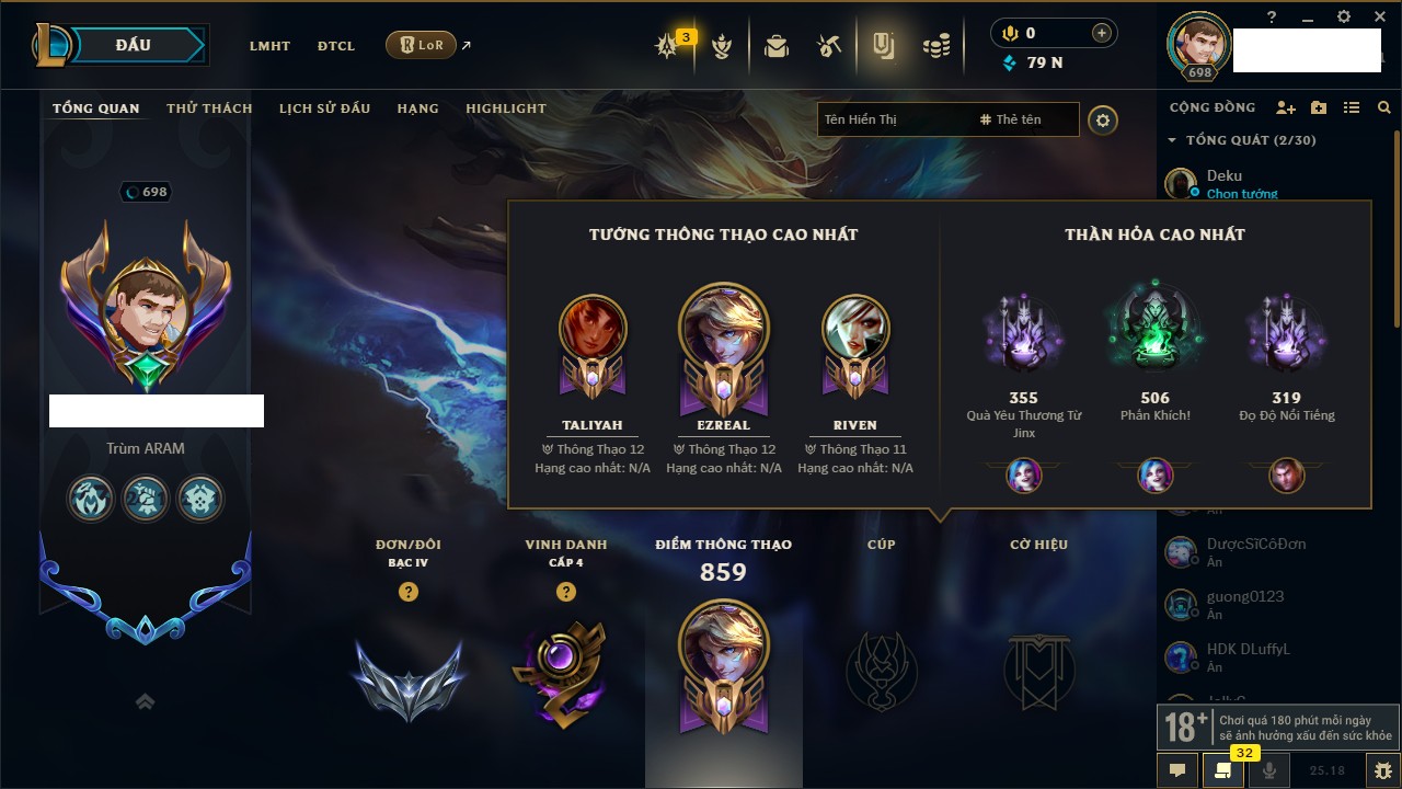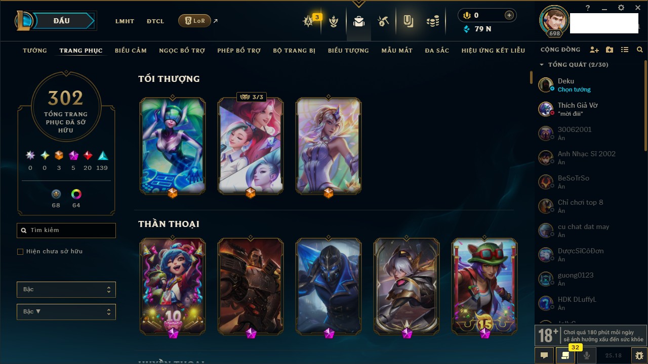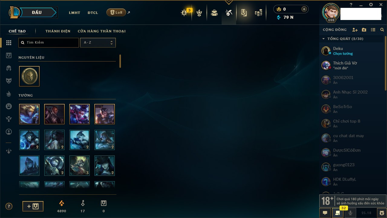 Rank Đơn: Đồng IIIKhung: Chưa có khungTướng: 171 - Còn 141757 THXTrang Phục: 268Rank ĐTCL: Bạch Kim IVLinh Thú: 209