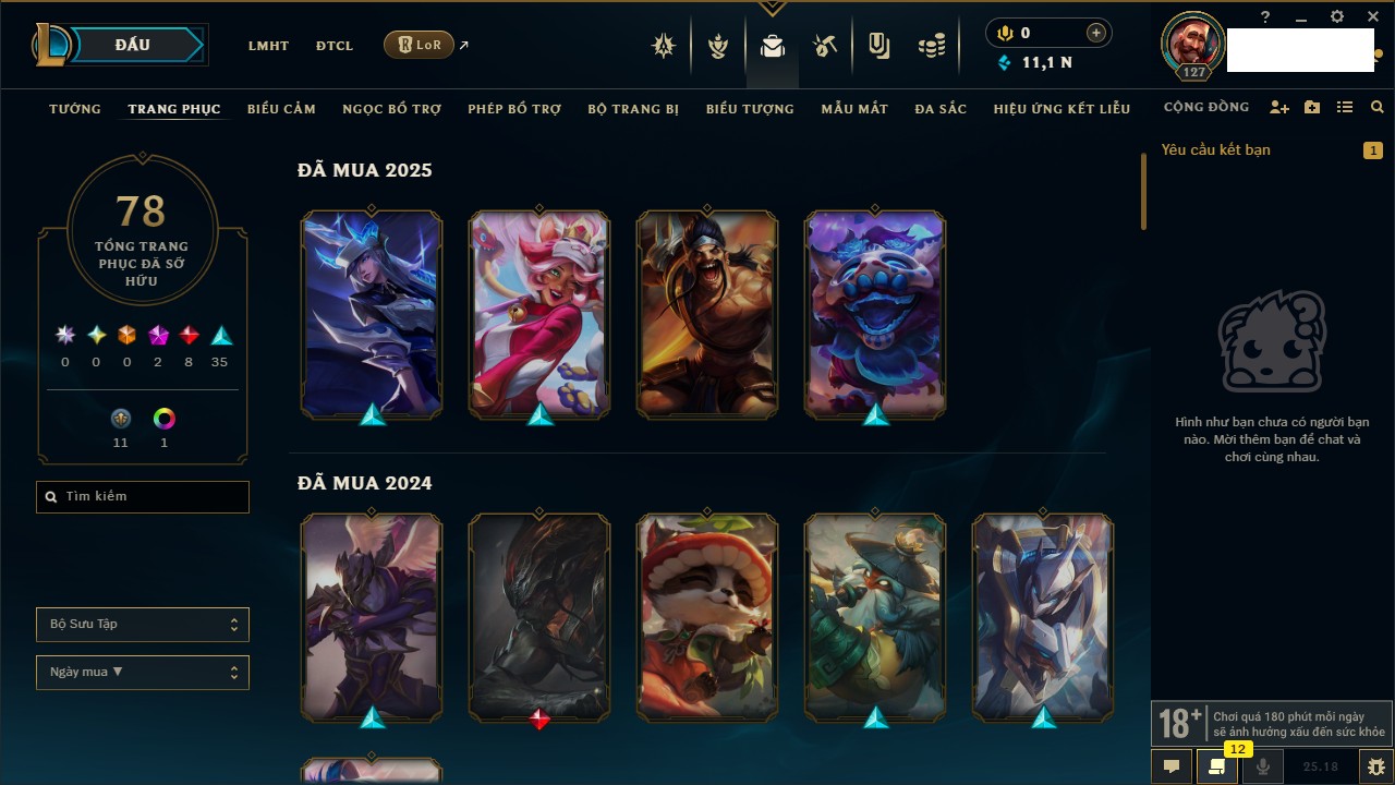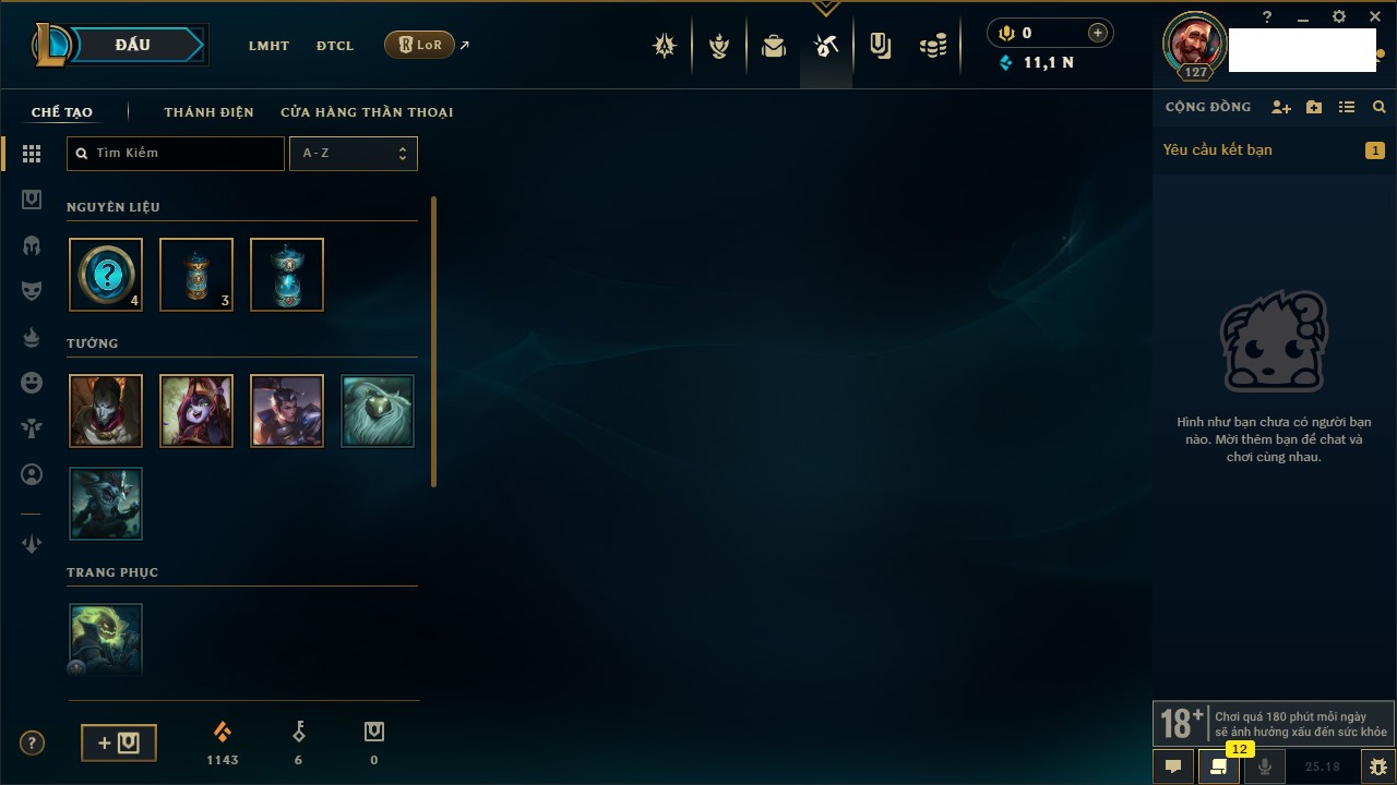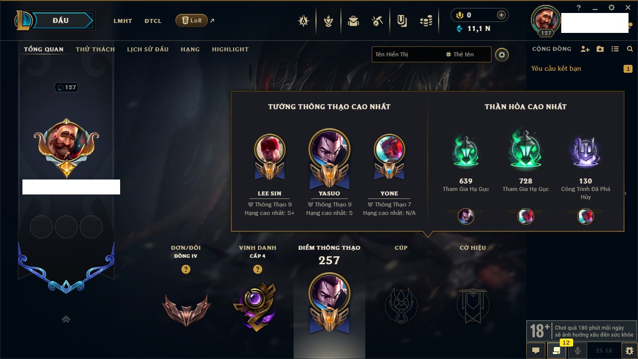 Rank Đơn: Vàng IVKhung: BạcTướng: 166 - Còn 180925 THXTrang Phục: 163Rank ĐTCL: Chưa RankLinh Thú: 67