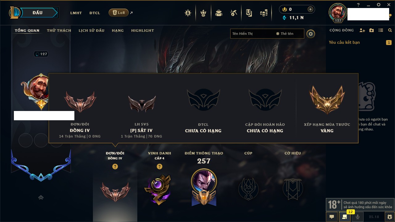 Rank Đơn: Vàng IVKhung: Chưa có khungTướng: 172 - Còn 55166 THXTrang Phục: 166Rank ĐTCL: Sắt IILinh Thú: 173