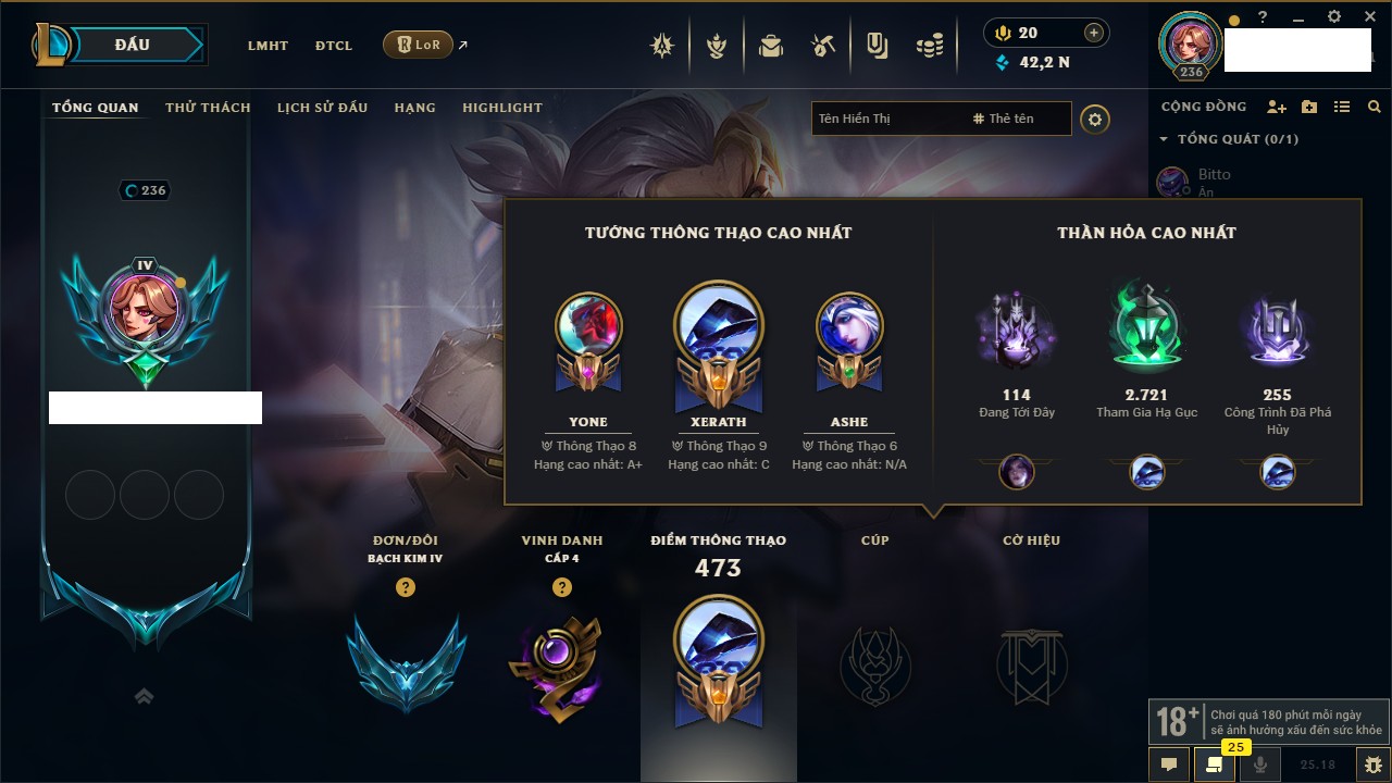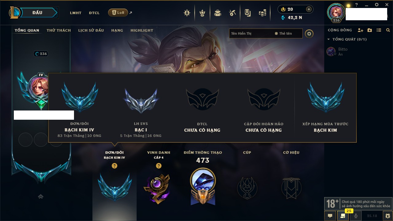 Rank Đơn: Bạch Kim IVKhung: Bạch kimTướng: 171 - Còn 182788 THXTrang Phục: 158Rank ĐTCL: Lục Bảo IVLinh Thú: 56