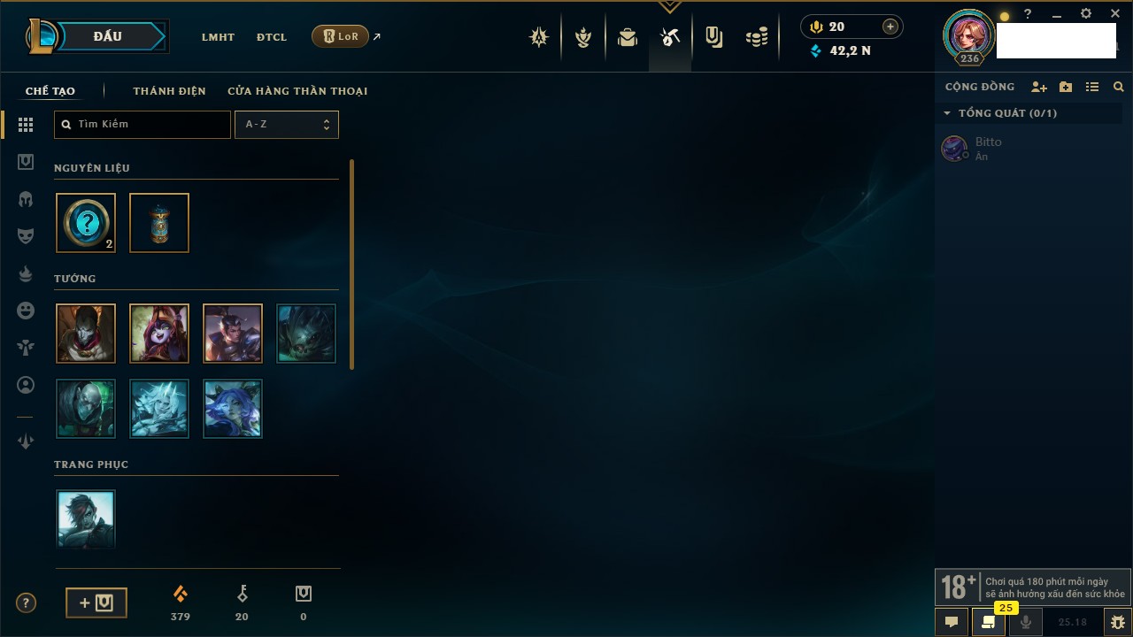 Rank Đơn: Bạch Kim IIKhung: Bạch kimTướng: 171 - Còn 263986 THXTrang Phục: 306Rank ĐTCL: Lục Bảo IVLinh Thú: 96