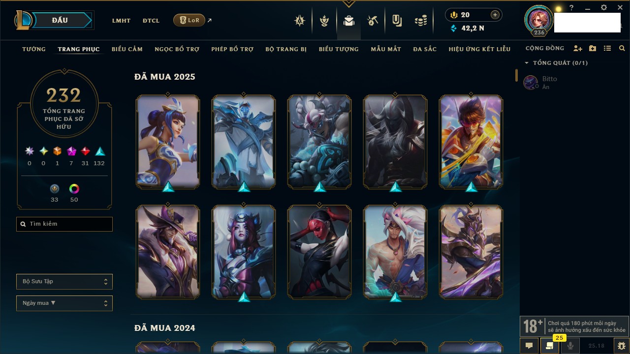 Rank Đơn: Đồng IIIKhung: ĐồngTướng: 170 - Còn 48082 THXTrang Phục: 272Rank ĐTCL: Chưa RankLinh Thú: 84