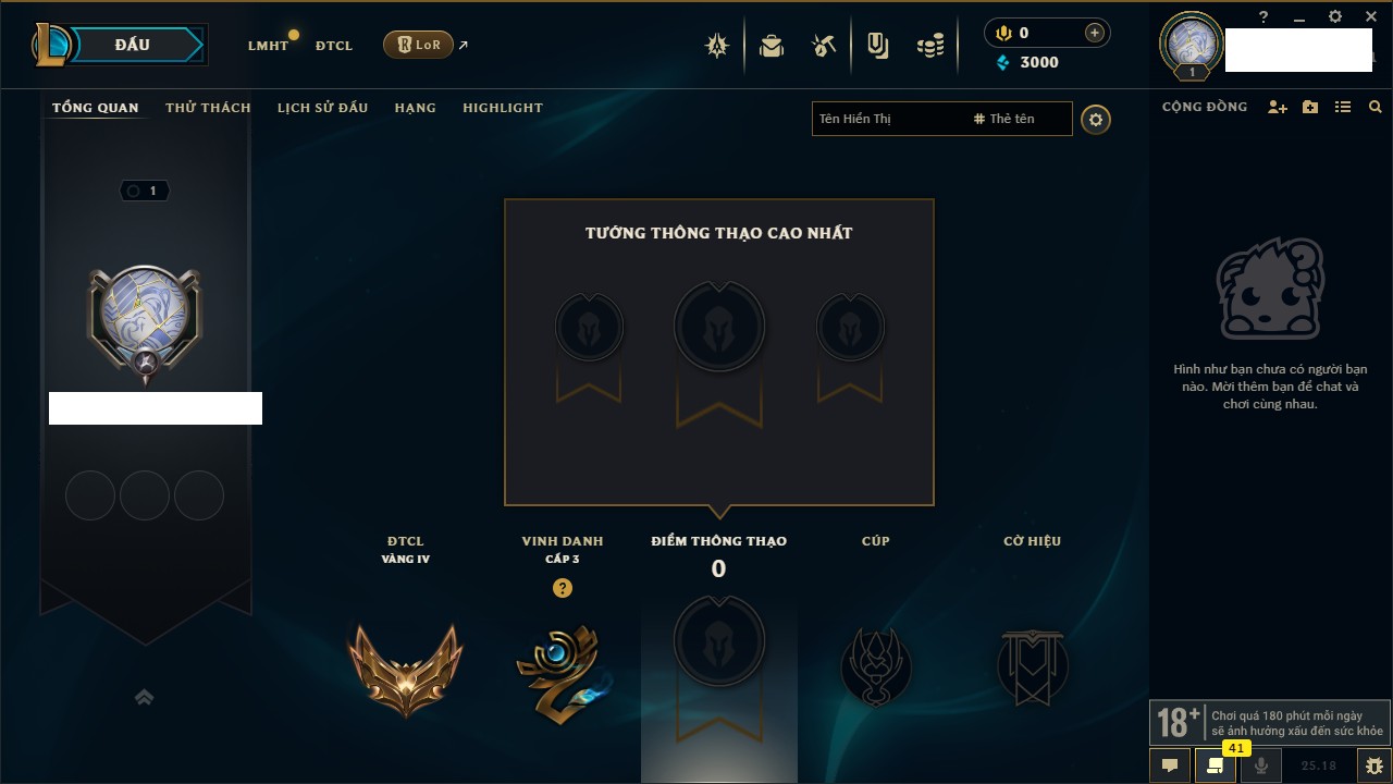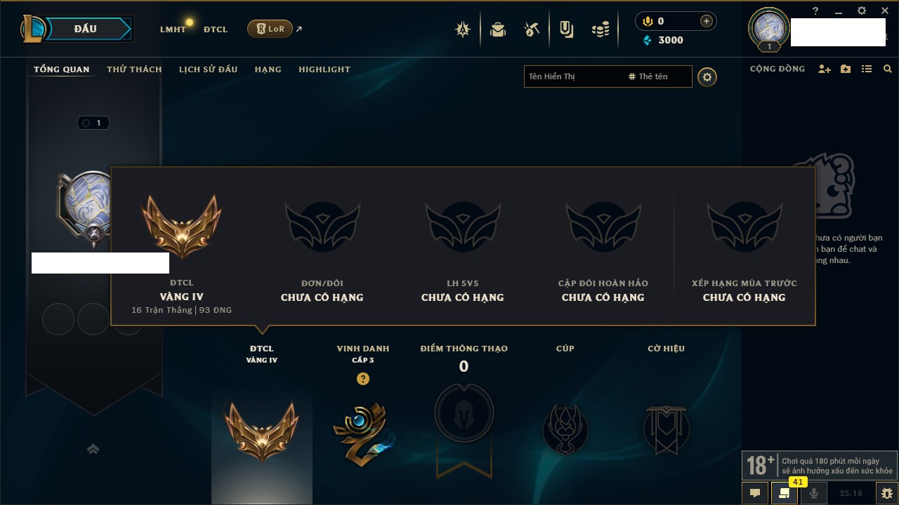 Rank Đơn: Chưa rank mùa nàoKhung: Chưa có khungTướng: 0 - Còn 6300 THXTrang Phục: 0Rank ĐTCL: Bạc IIILinh Thú: 3