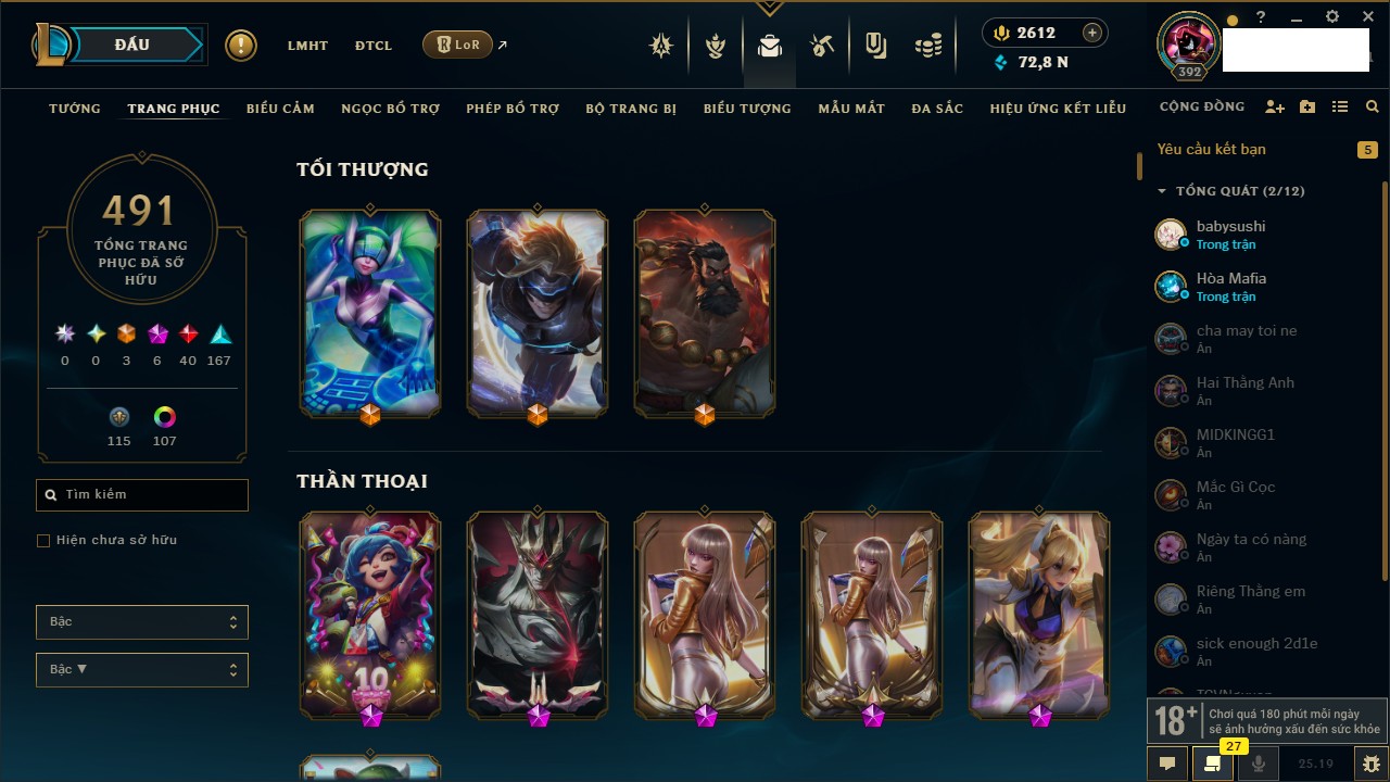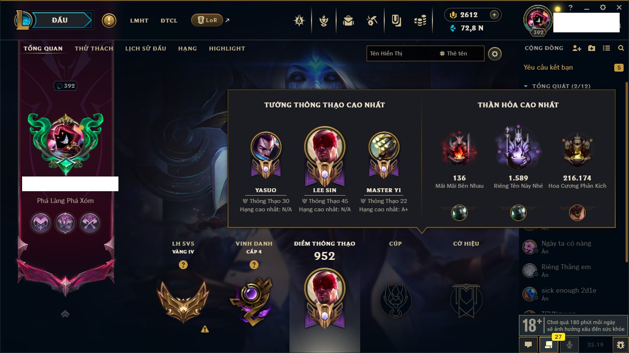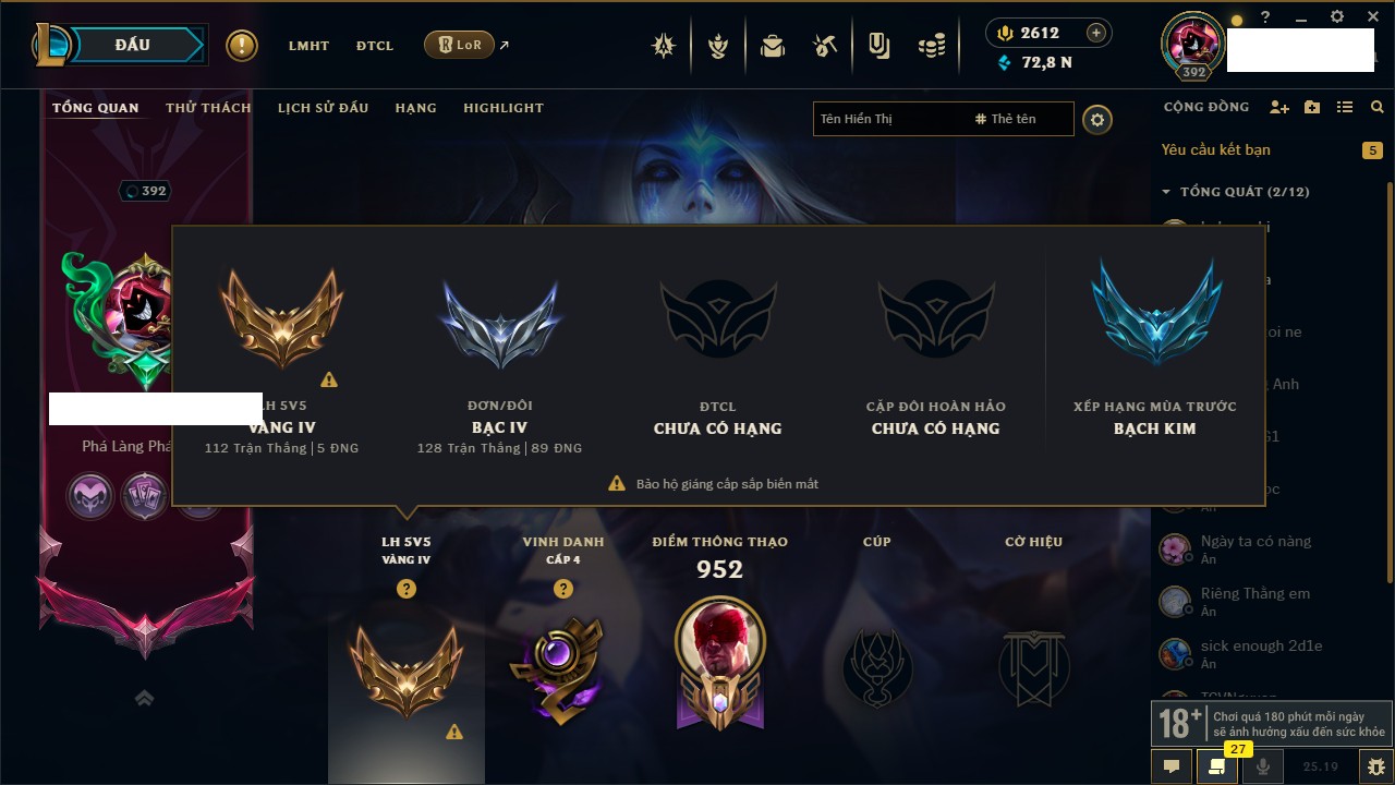 Rank Đơn: Vàng III Khung: Vàng Tướng: 171 - Còn 91047 THX Trang Phục: 98 Rank ĐTCL: Bạch Kim IV Linh Thú: 281