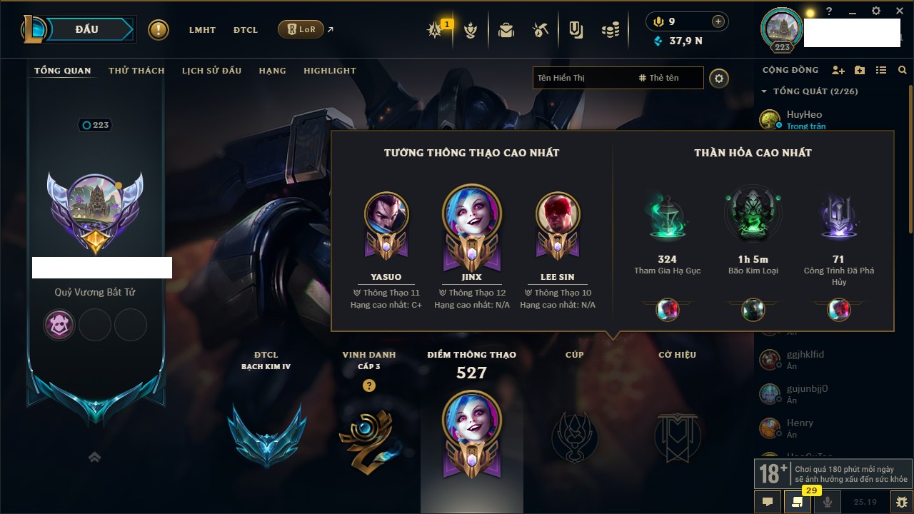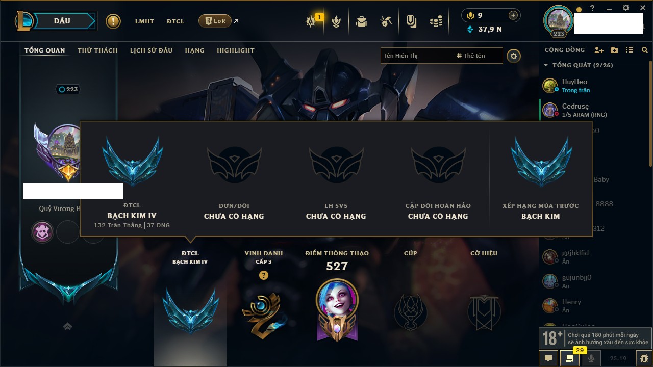Rank Đơn: Bạch Kim IIKhung: Bạch kimTướng: 171 - Còn 316137 THXTrang Phục: 89Rank ĐTCL: Bạch Kim IIILinh Thú: 94
