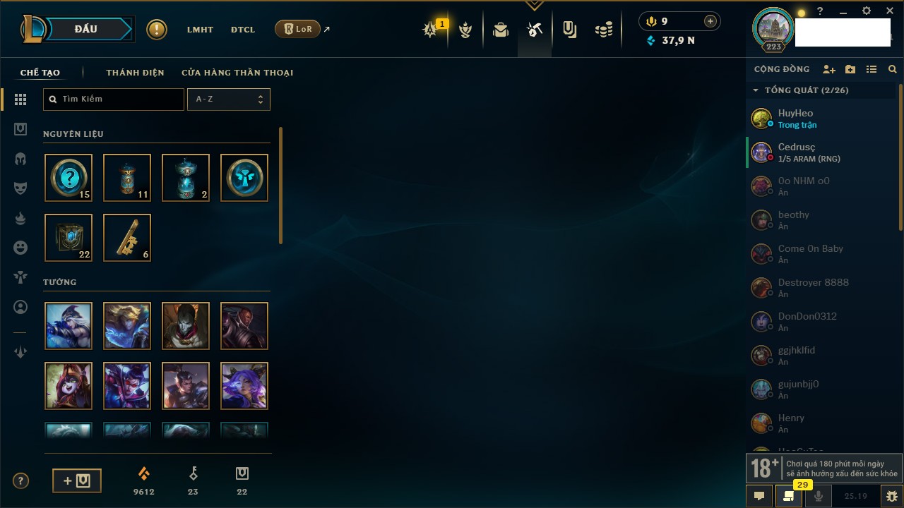 Rank Đơn: Lục Bảo IVKhung: VàngTướng: 171 - Còn 154648 THXTrang Phục: 203Rank ĐTCL: Bạch Kim IVLinh Thú: 69