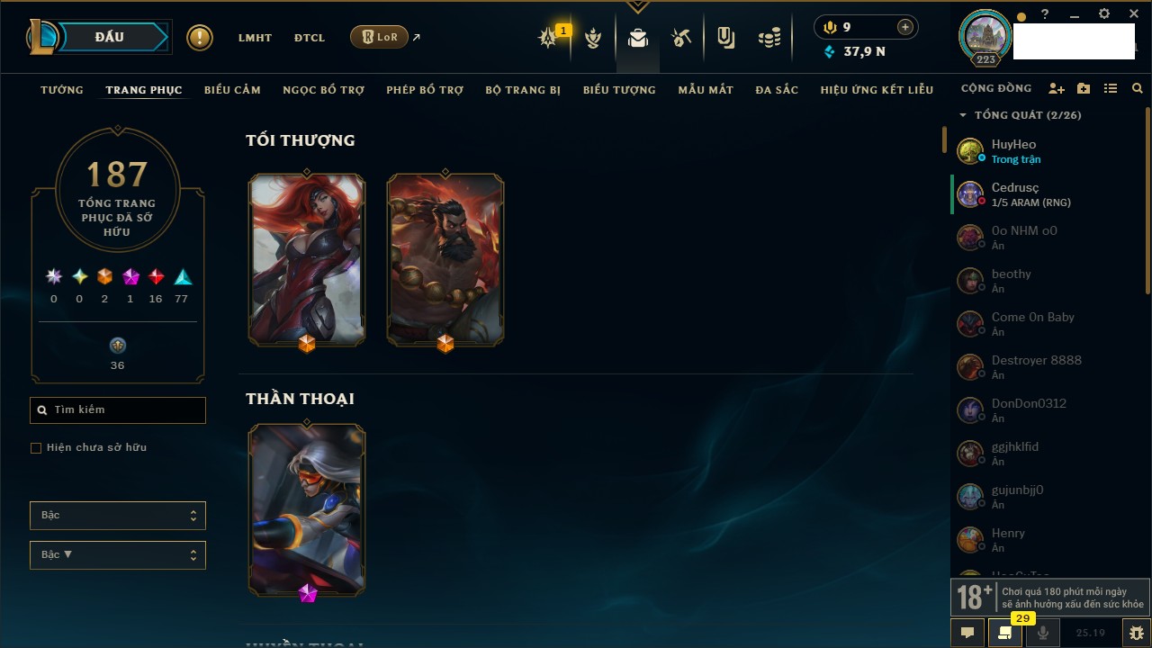 Rank Đơn: Vàng IIKhung: VàngTướng: 170 - Còn 243330 THXTrang Phục: 230Rank ĐTCL: Chưa RankLinh Thú: 68