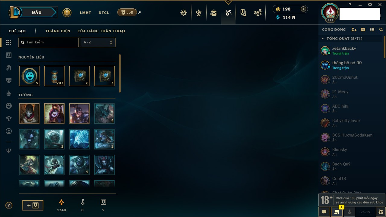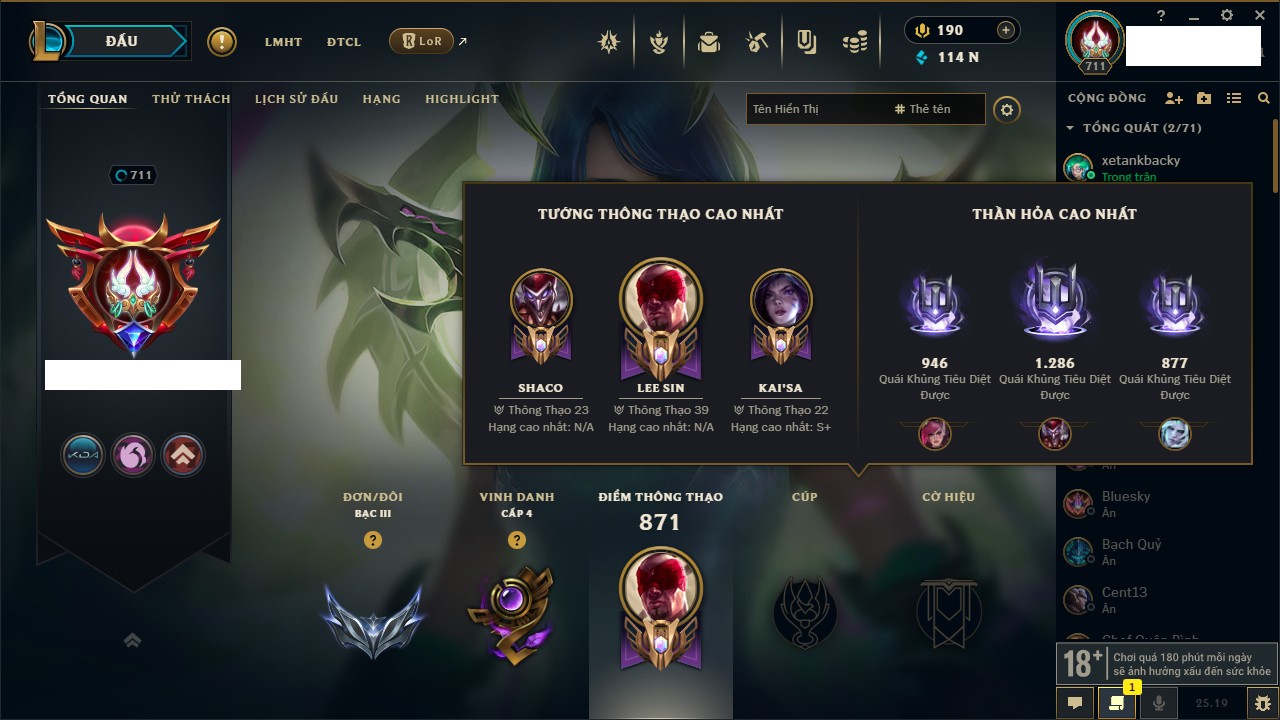 Rank Đơn: Bạch Kim IIIKhung: Bạch kimTướng: 170 - Còn 61079 THXTrang Phục: 352Rank ĐTCL: Sắt IILinh Thú: 70