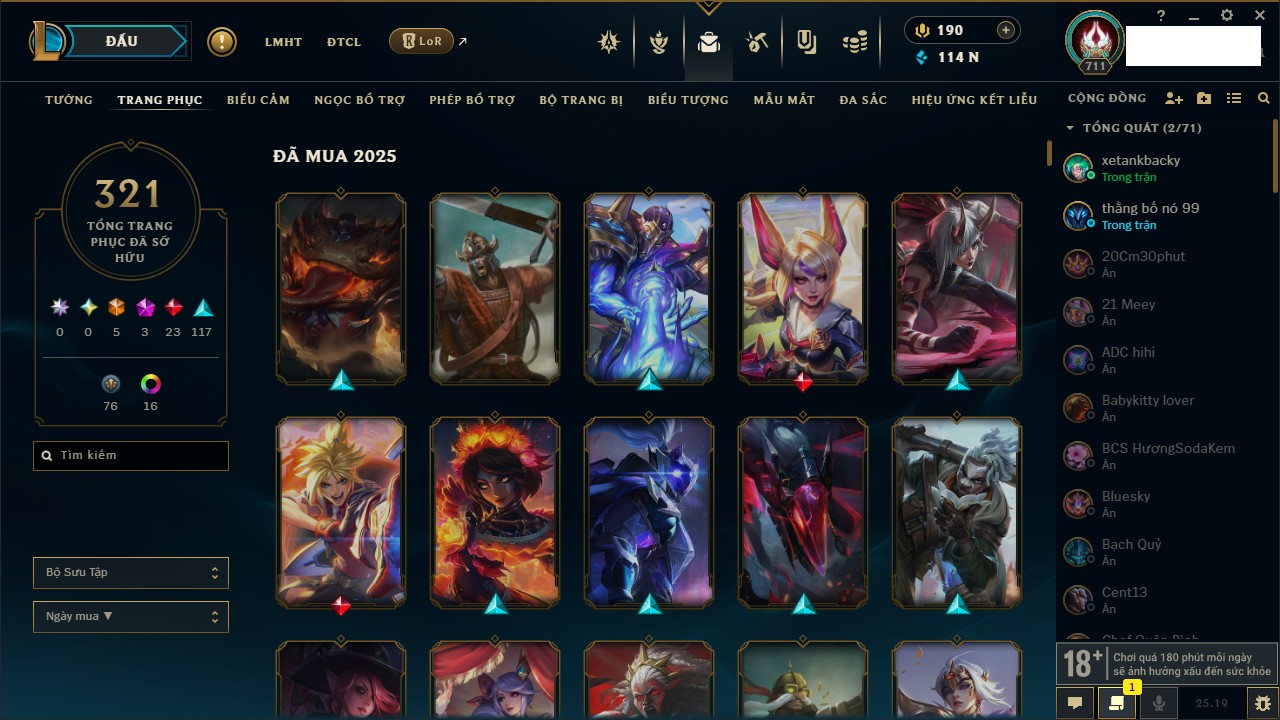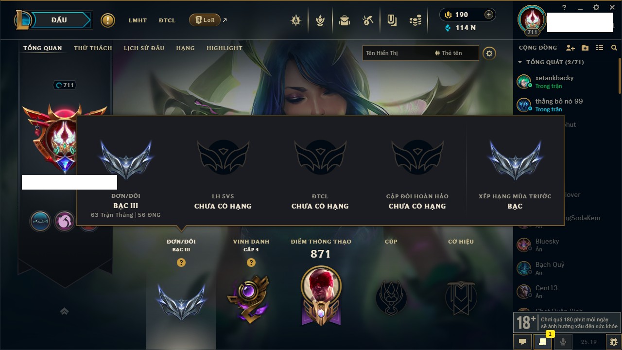 Rank Đơn: Vàng IKhung: Bạch kimTướng: 170 - Còn 212450 THXTrang Phục: 214Rank ĐTCL: Bạch Kim IVLinh Thú: 221
