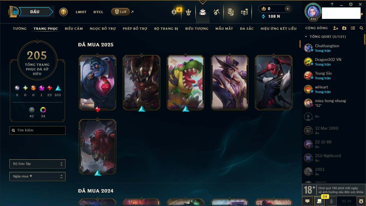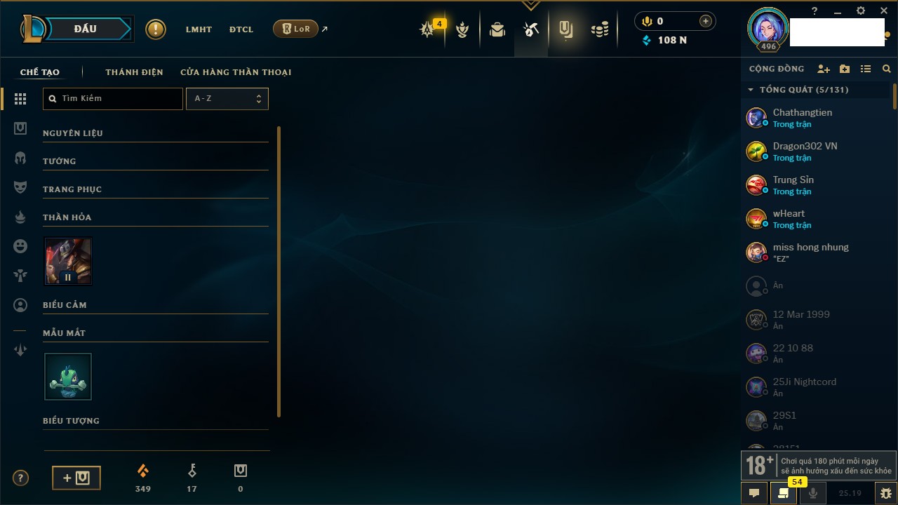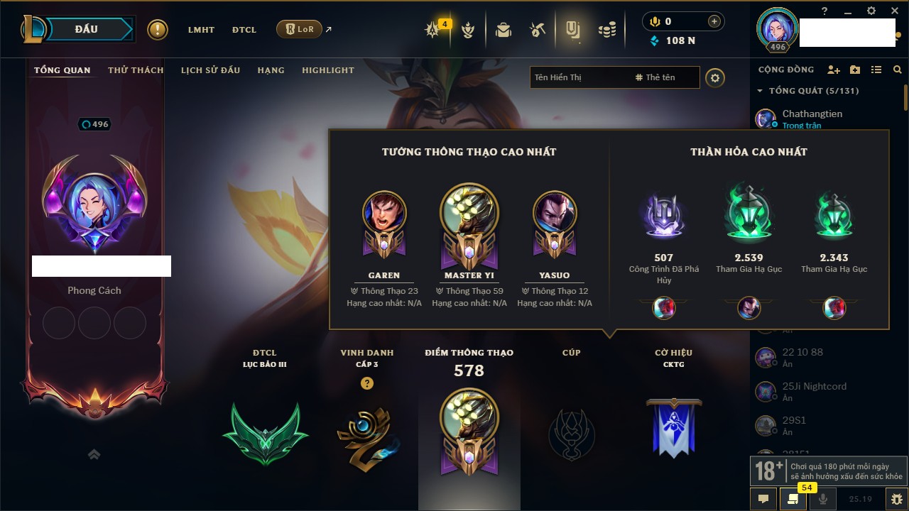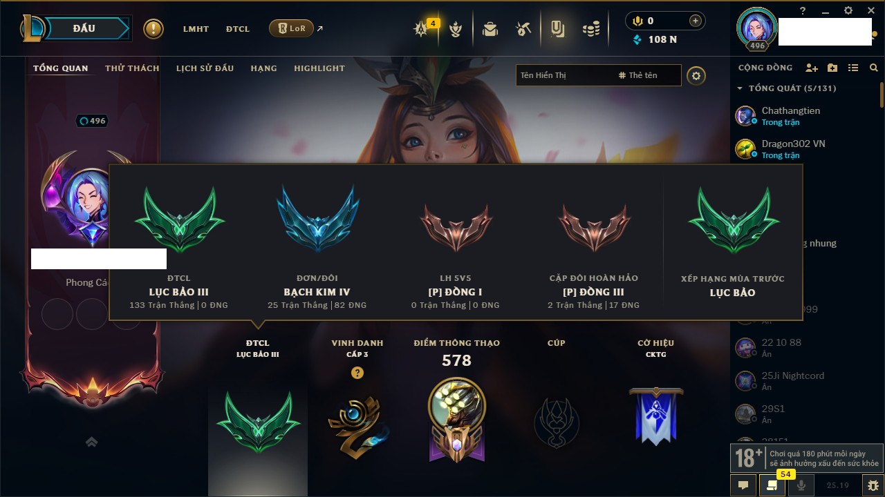 Rank Đơn: Vàng IIKhung: VàngTướng: 171 - Còn 219803 THXTrang Phục: 254Rank ĐTCL: Chưa RankLinh Thú: 78