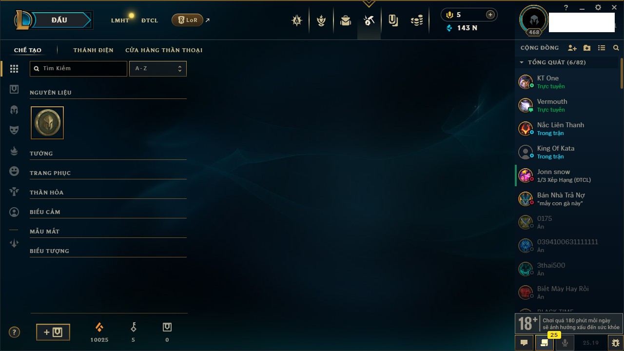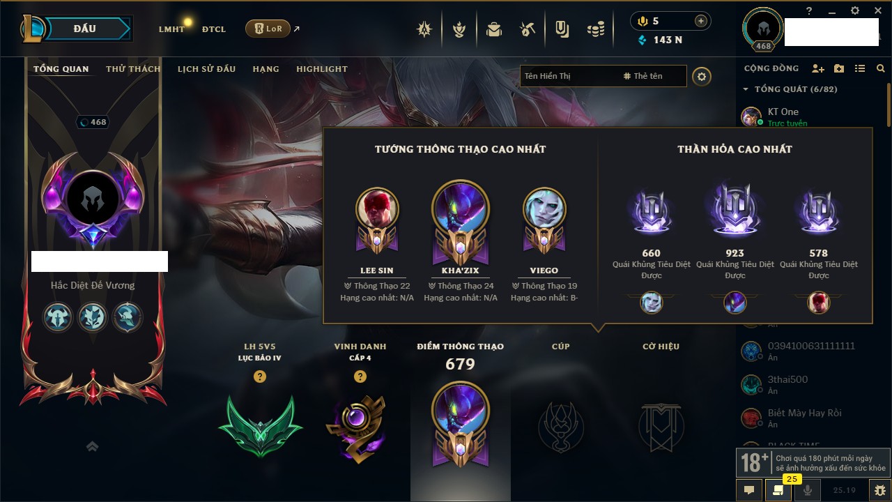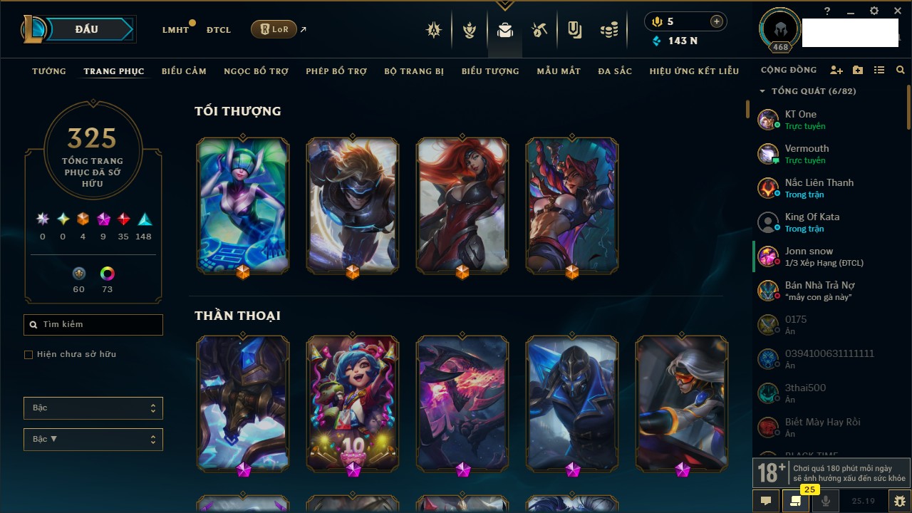 Rank Đơn: Bạc IIKhung: Bạch kimTướng: 169 - Còn 81813 THXTrang Phục: 301Rank ĐTCL: Chưa RankLinh Thú: 140