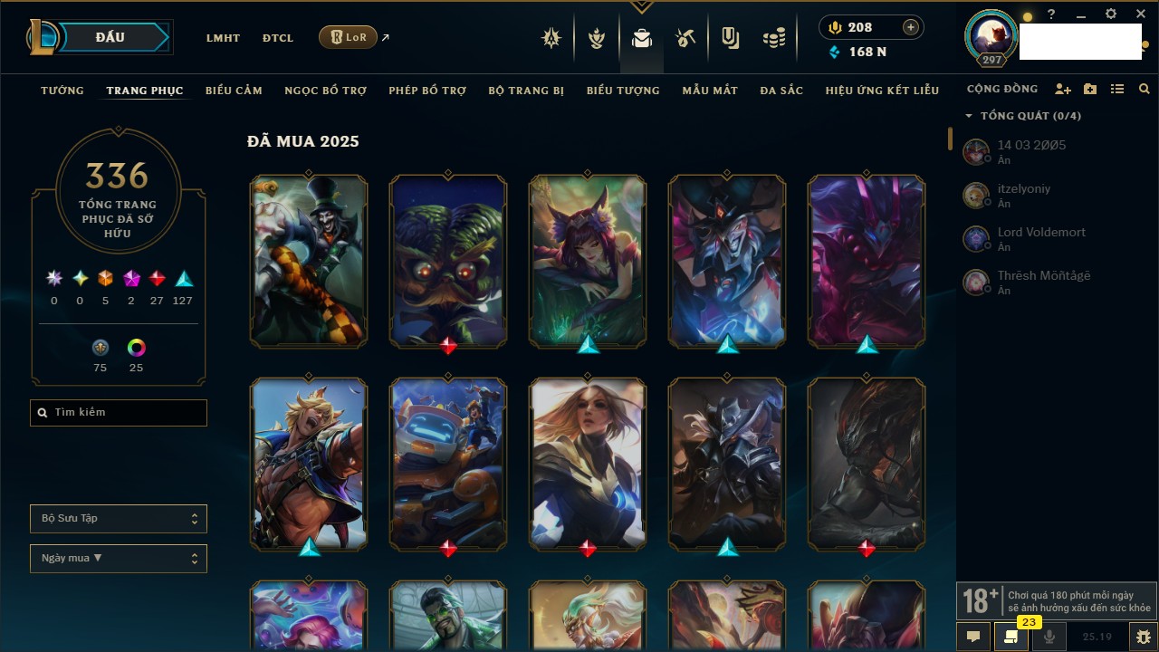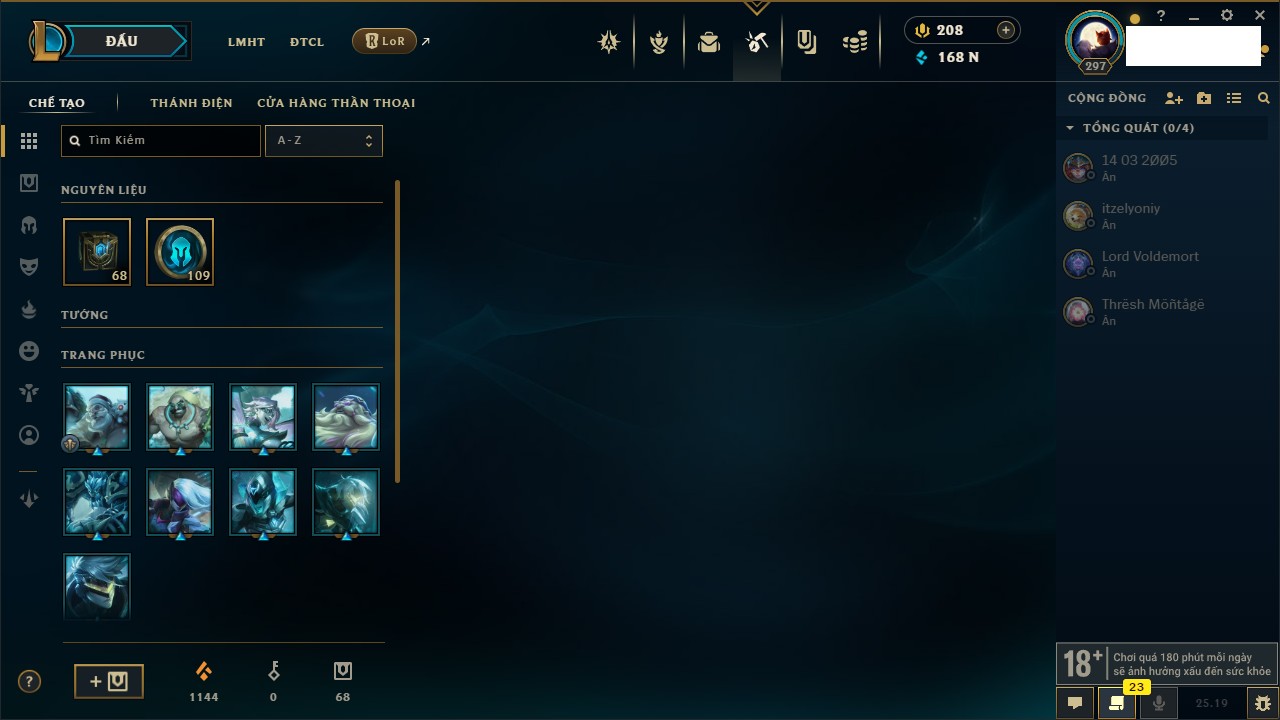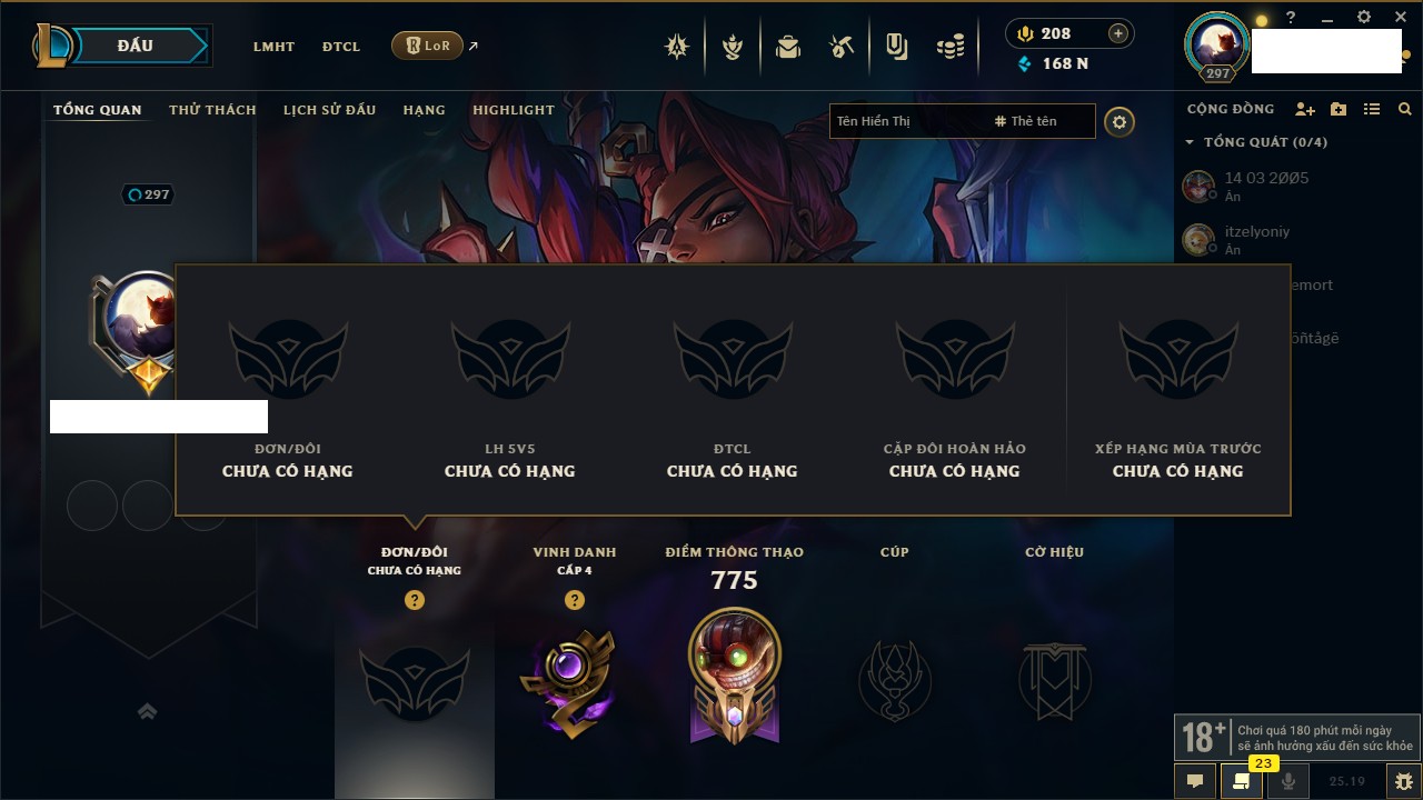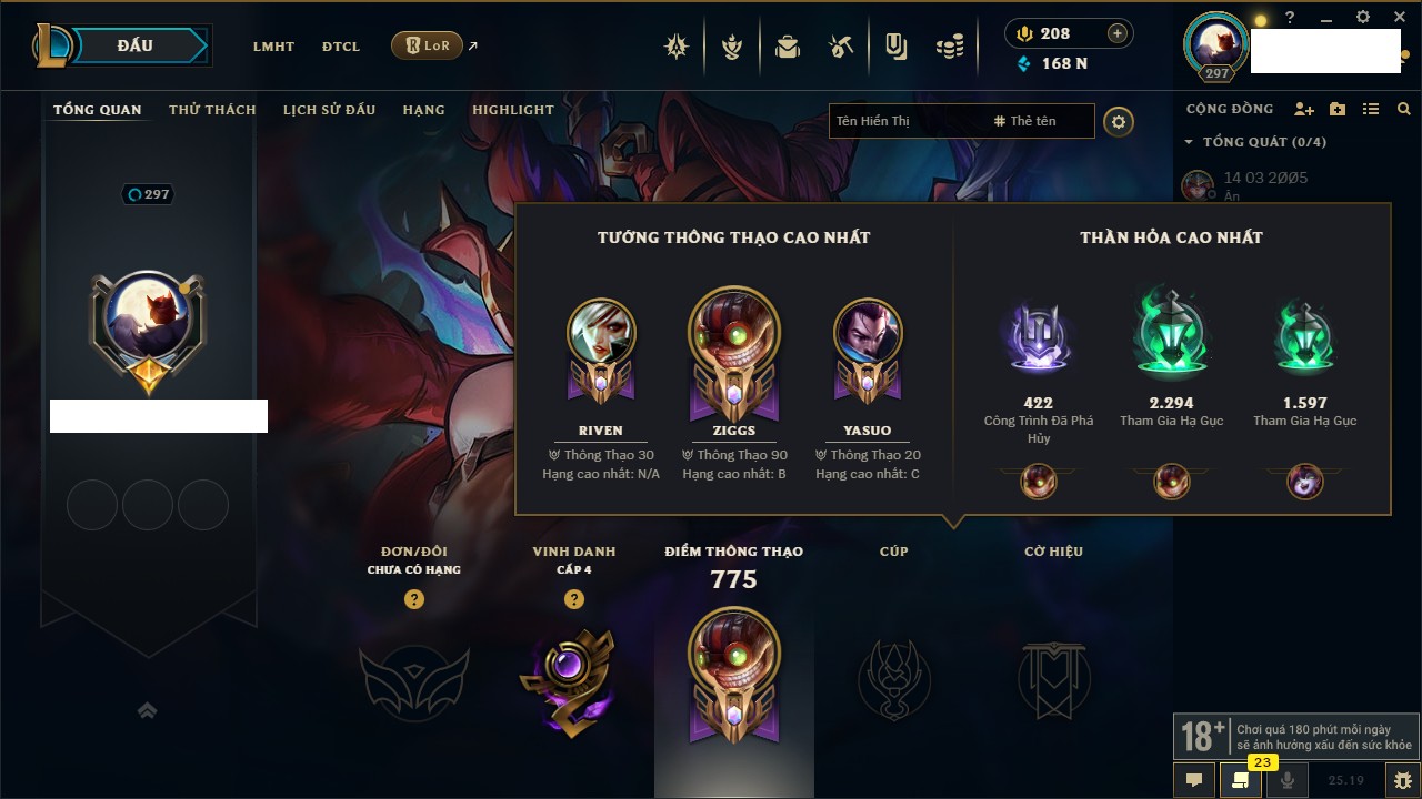 Rank Đơn: Vàng IKhung: BạcTướng: 171 - Còn 60584 THXTrang Phục: 286Rank ĐTCL: Vàng IIILinh Thú: 117