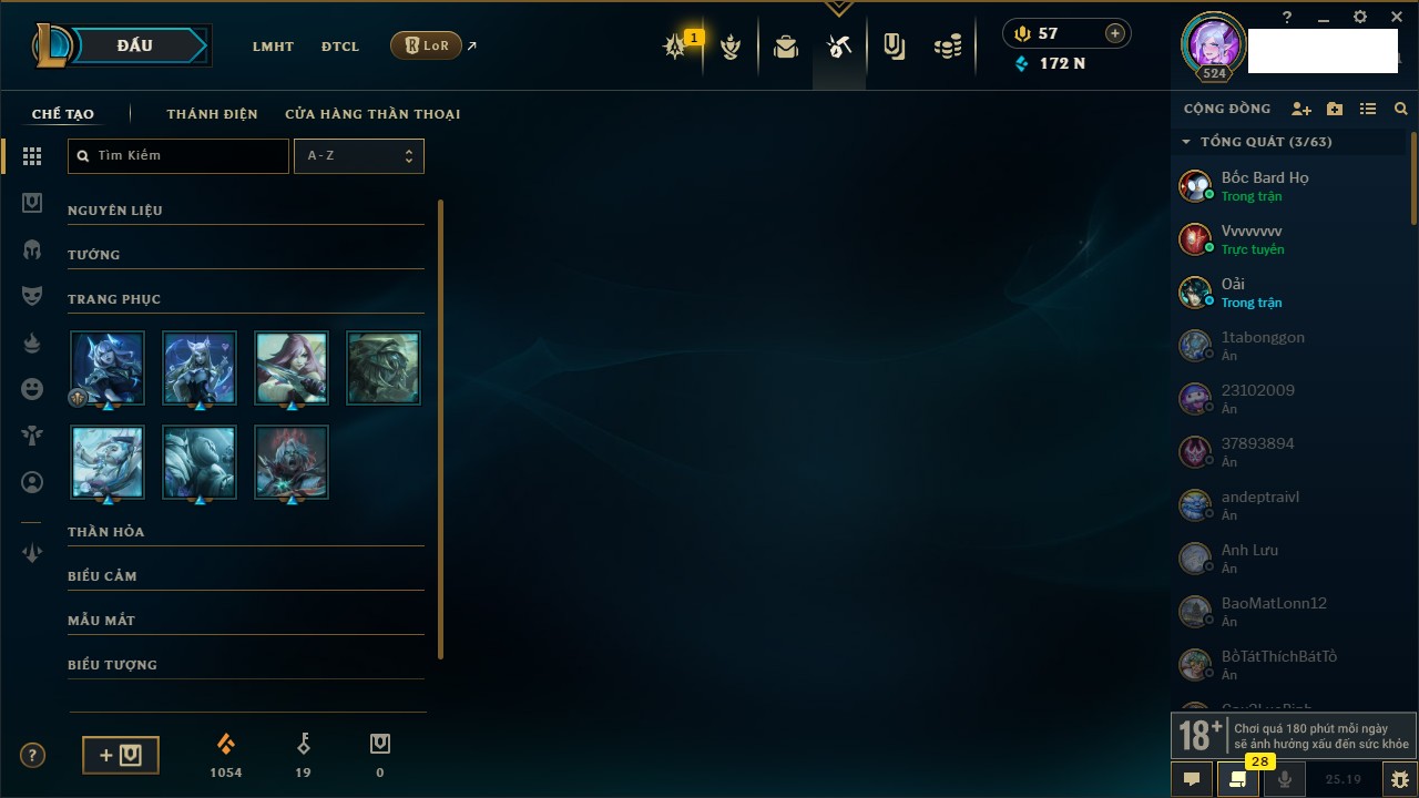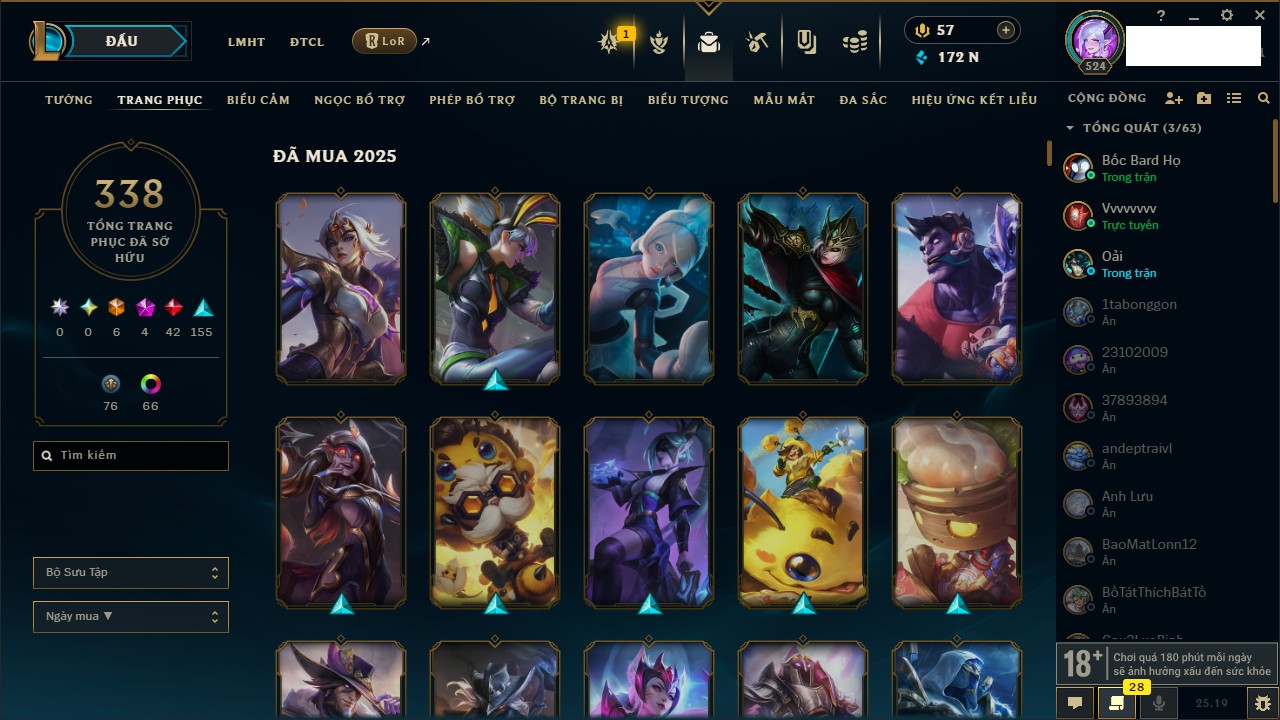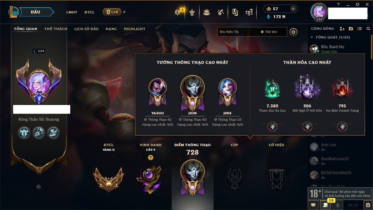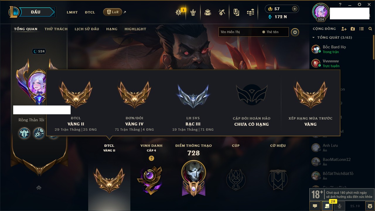 Rank Đơn: Vàng IKhung: Bạch kimTướng: 170 - Còn 212450 THXTrang Phục: 214Rank ĐTCL: Bạch Kim IVLinh Thú: 221