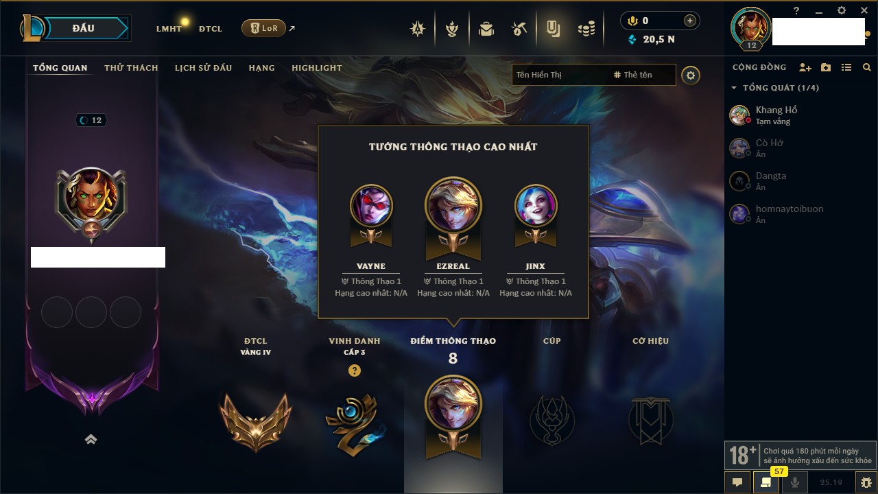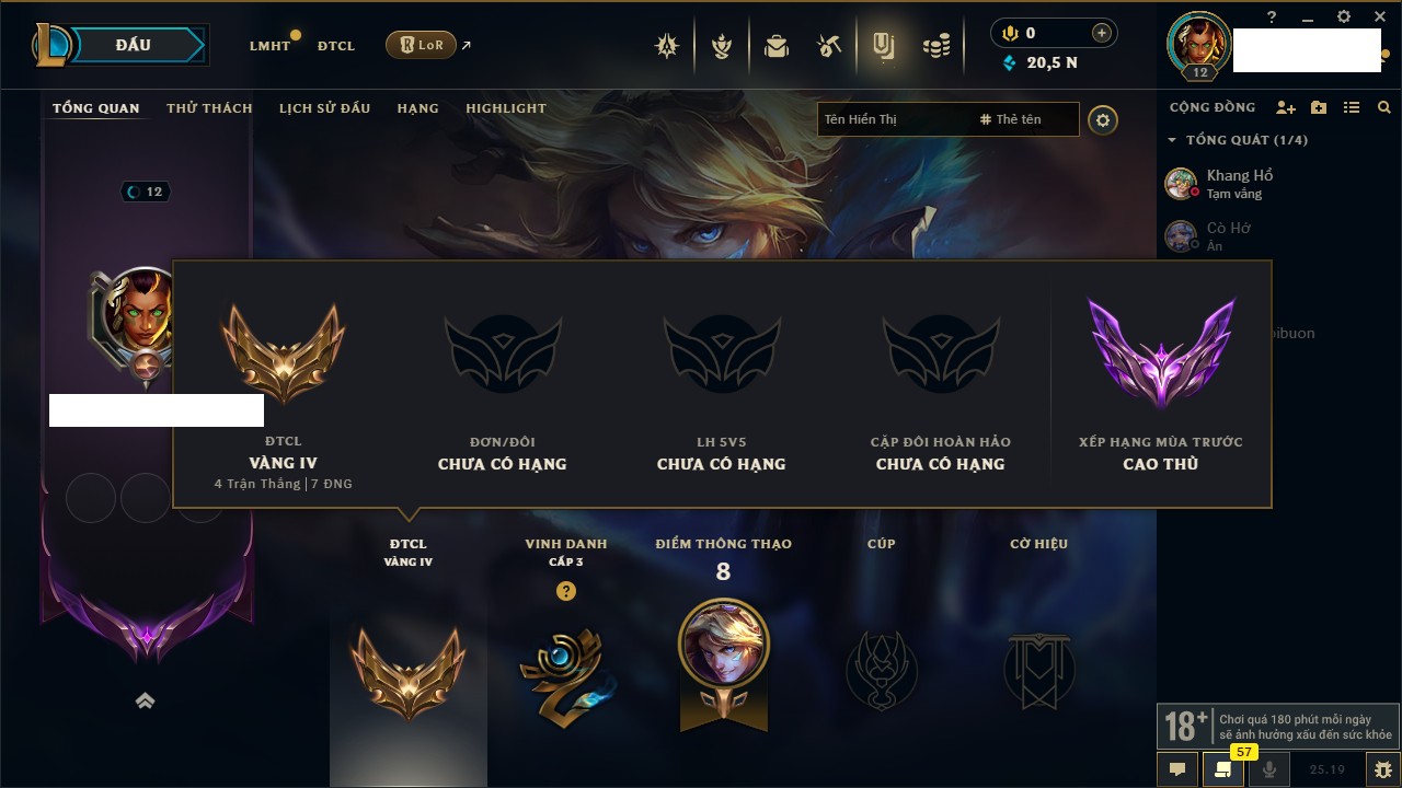 Rank Đơn: Chưa rank mùa nàoKhung: Chưa có khungTướng: 4 - Còn 12000 THXTrang Phục: 0Rank ĐTCL: Bạch Kim IIILinh Thú: 20