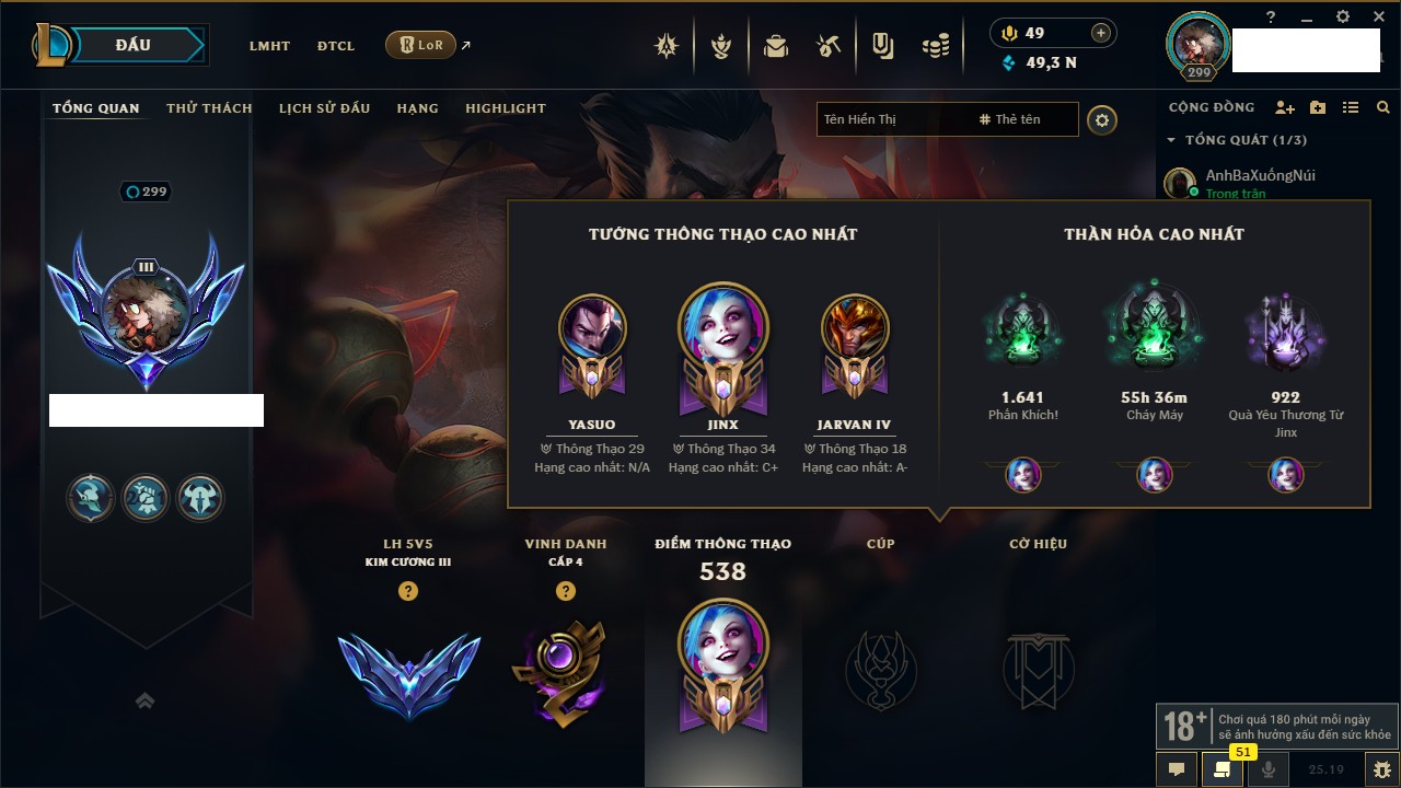 Rank Đơn: Bạch Kim IIKhung: Bạch kimTướng: 171 - Còn 97913 THXTrang Phục: 261Rank ĐTCL: Chưa RankLinh Thú: 46