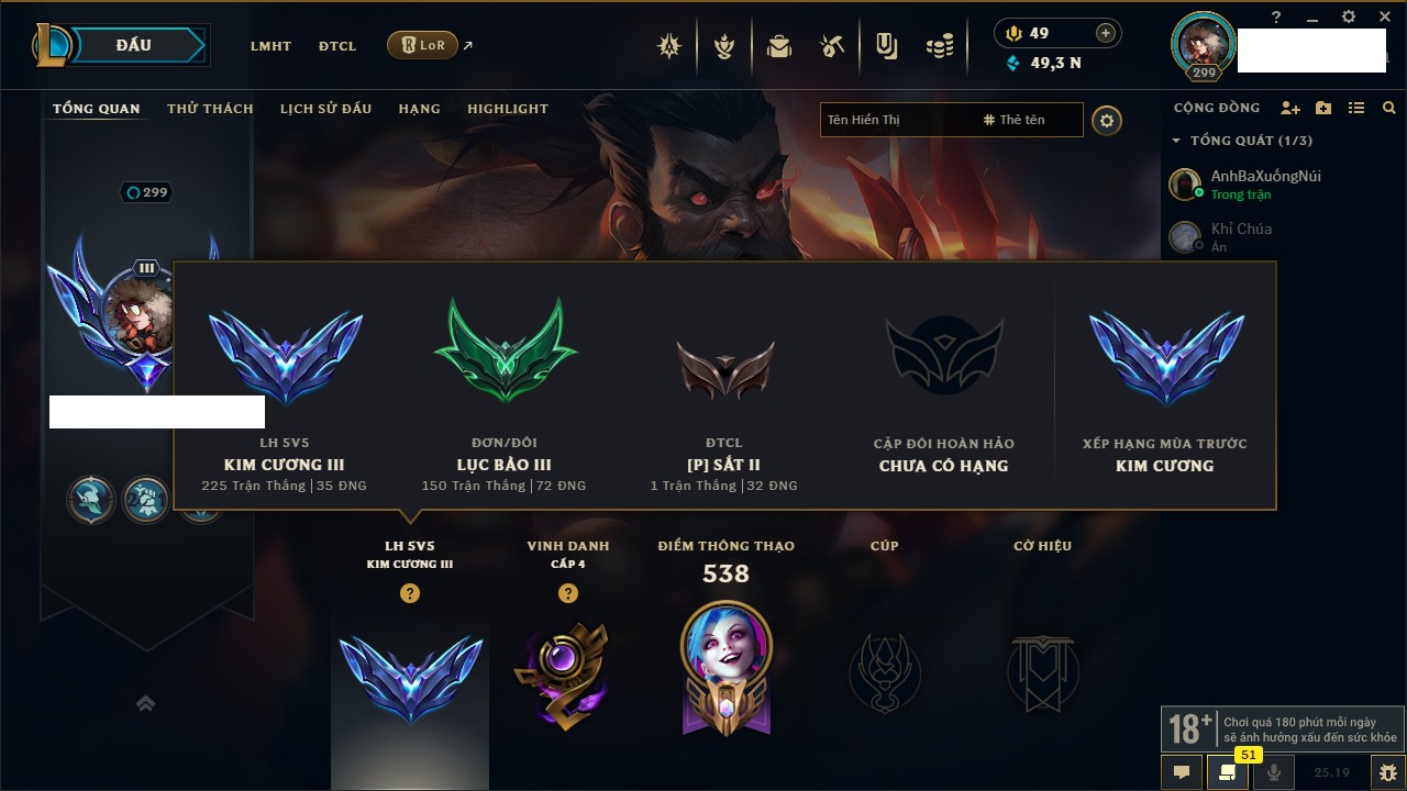 Rank Đơn: Lục Bảo IVKhung: VàngTướng: 171 - Còn 154648 THXTrang Phục: 203Rank ĐTCL: Bạch Kim IVLinh Thú: 69