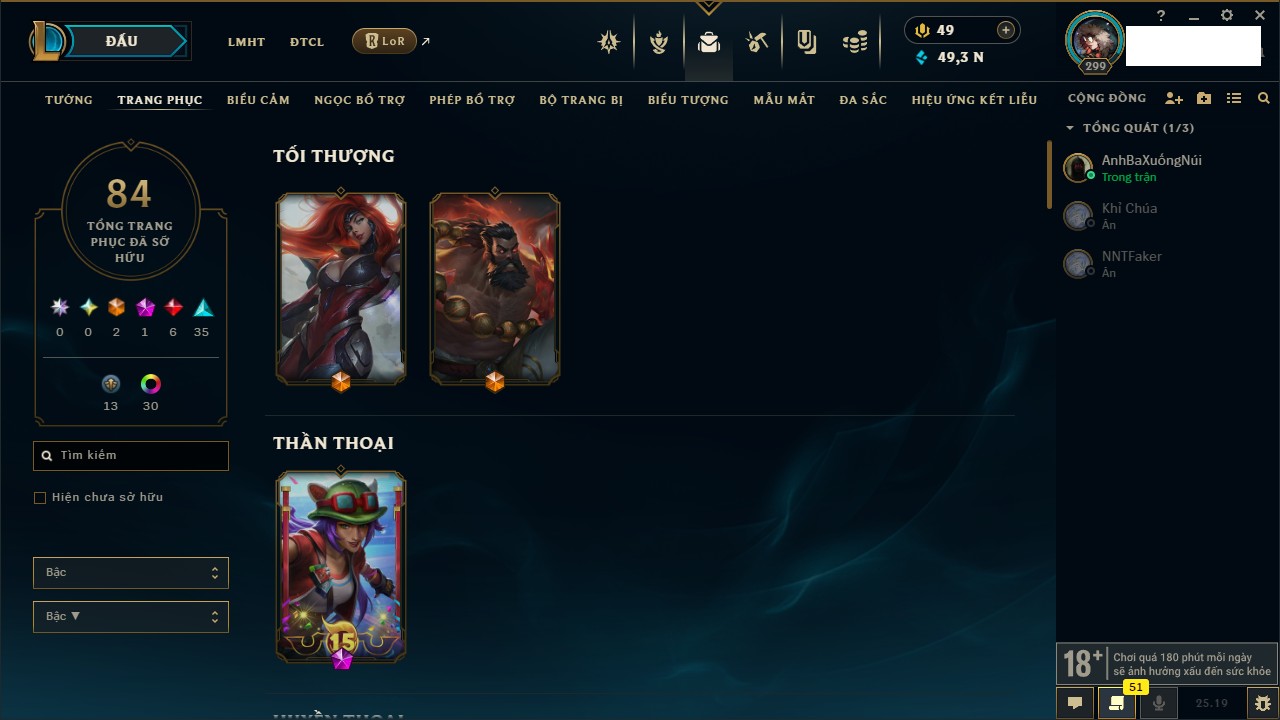 Rank Đơn: Bạch Kim IIKhung: Bạch kimTướng: 171 - Còn 316137 THXTrang Phục: 89Rank ĐTCL: Bạch Kim IIILinh Thú: 94