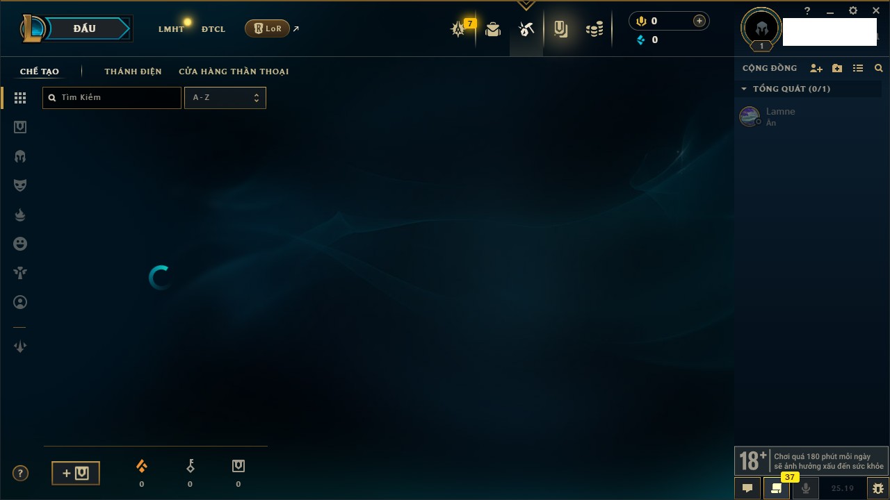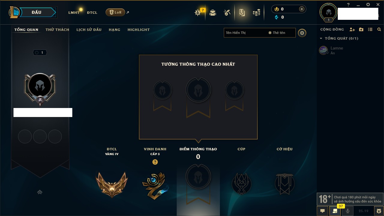 Rank Đơn: Chưa RankKhung: Chưa có khungTướng: 37 - Còn 27387 THXTrang Phục: 10Rank ĐTCL: Chưa RankLinh Thú: 1