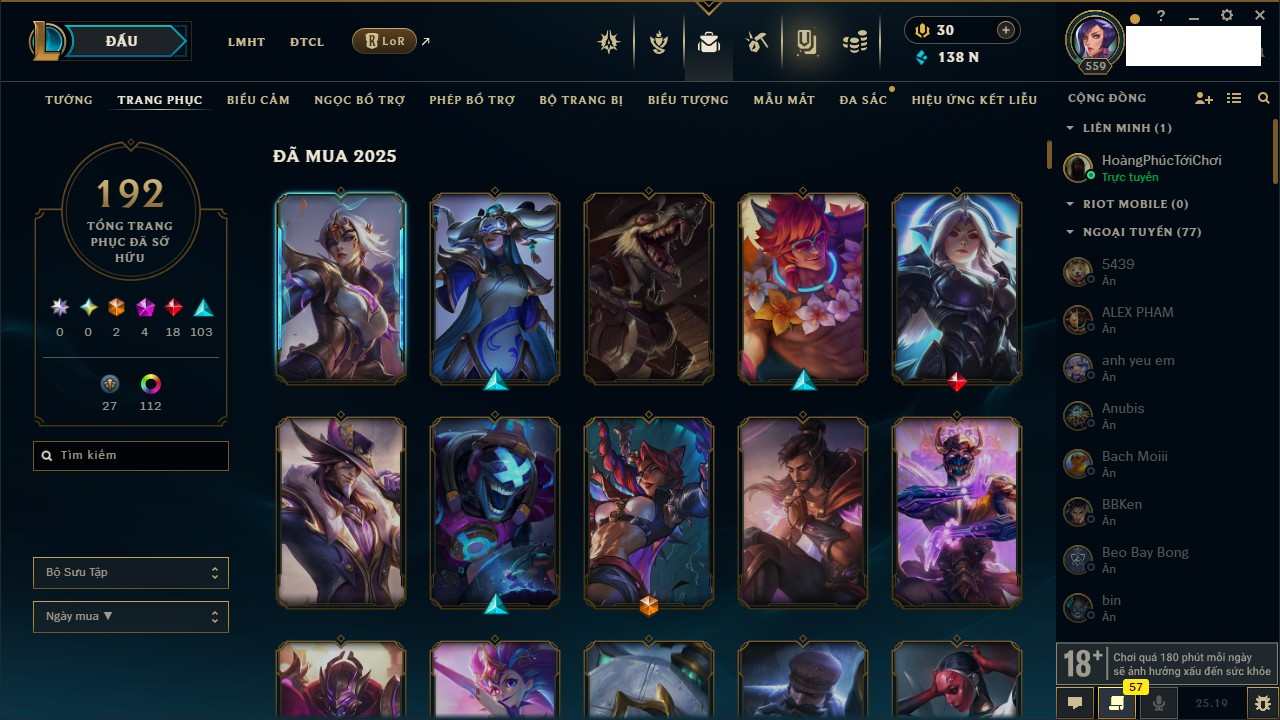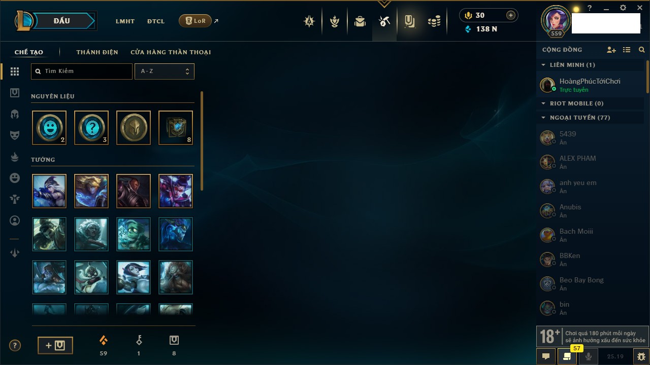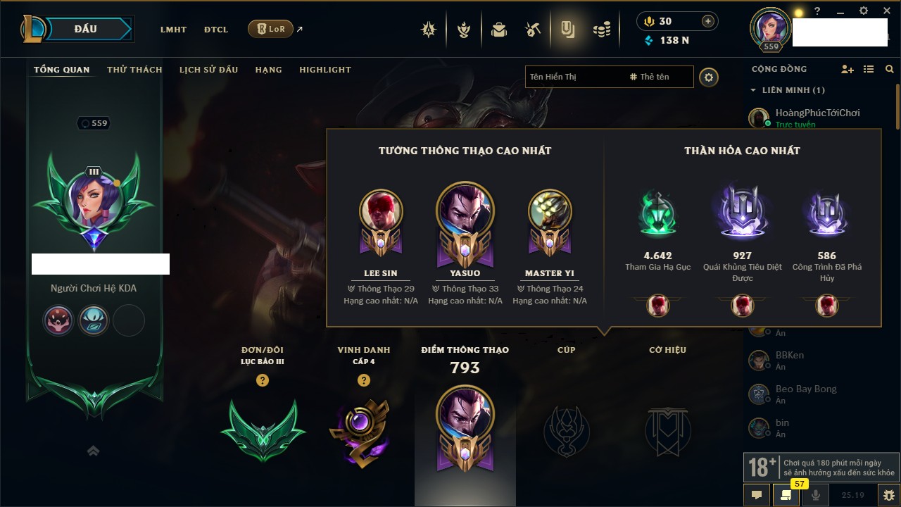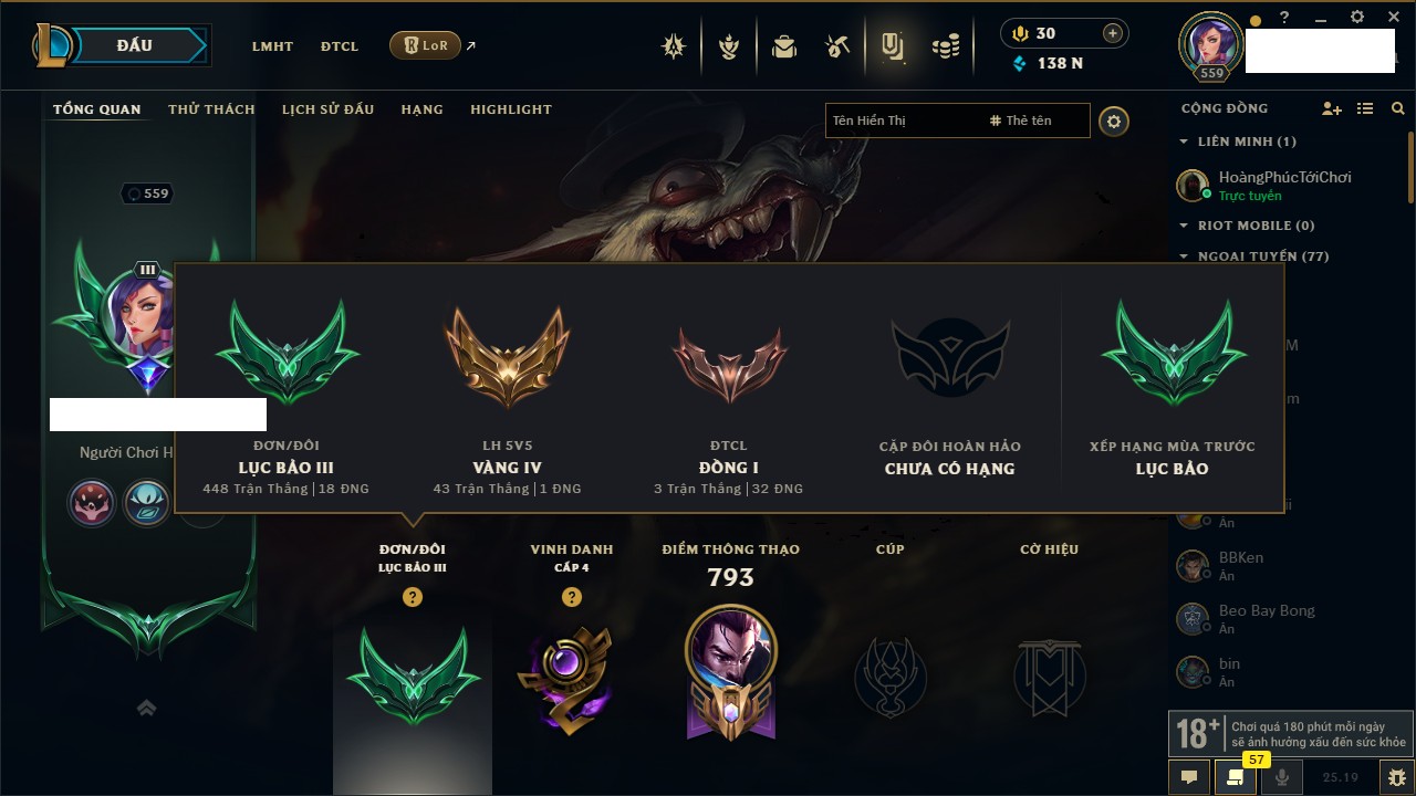 Rank Đơn: Bạch Kim IIKhung: Bạch kimTướng: 171 - Còn 316137 THXTrang Phục: 89Rank ĐTCL: Bạch Kim IIILinh Thú: 94