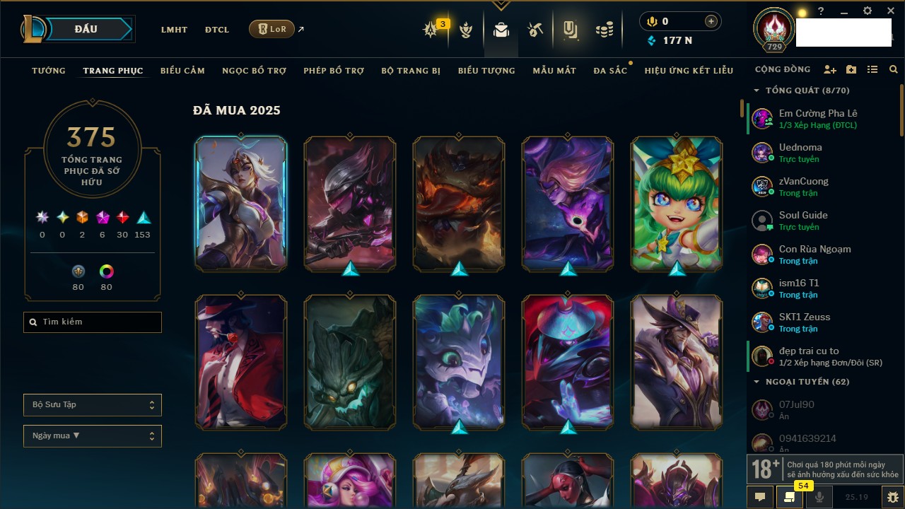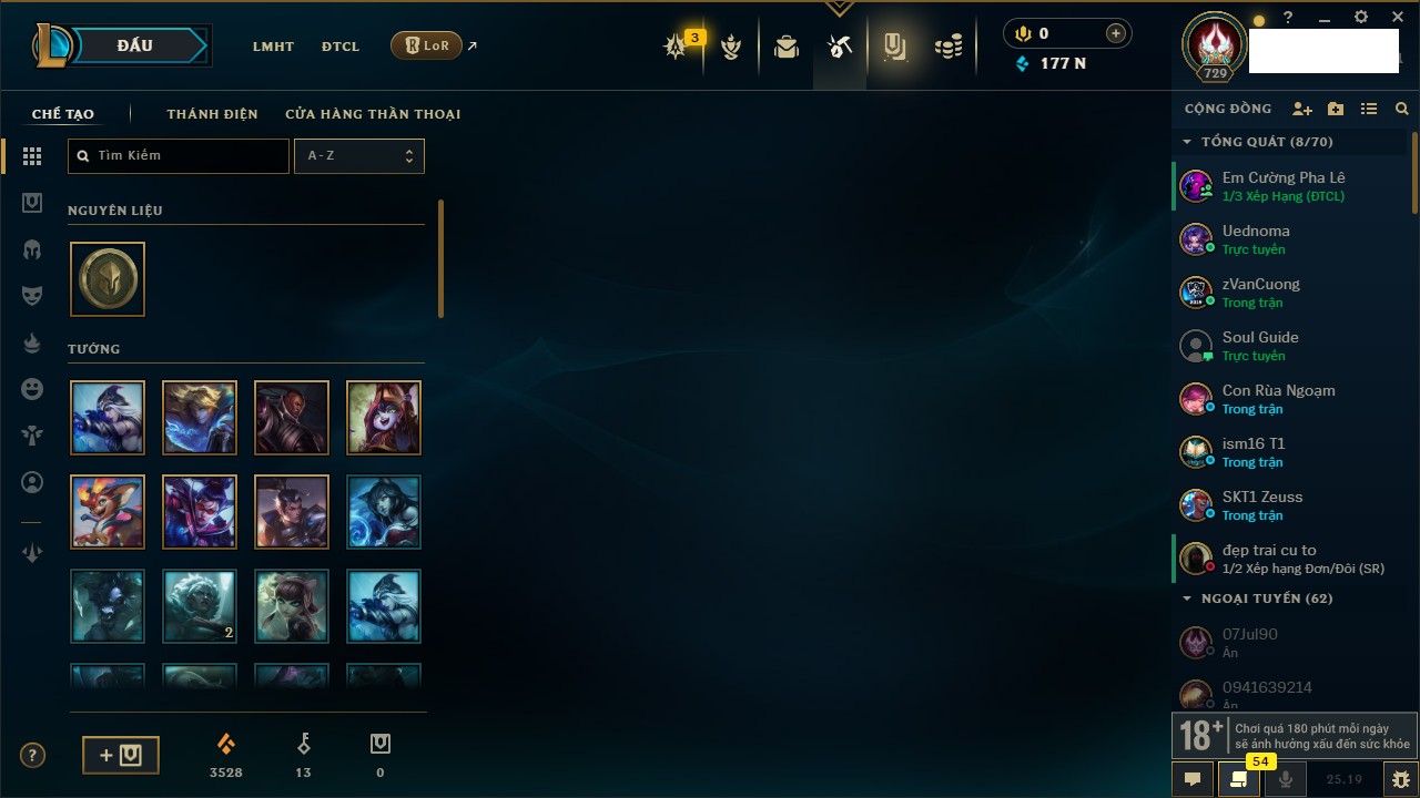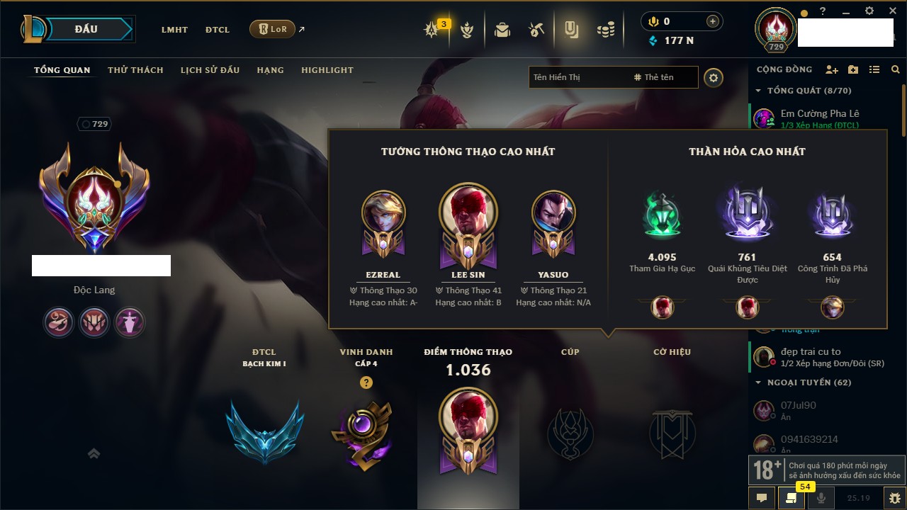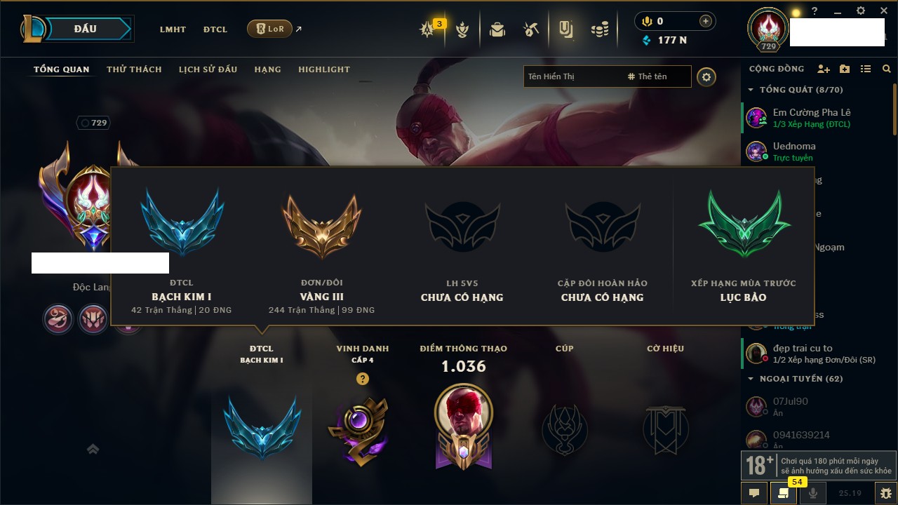 Rank Đơn: Bạc IIKhung: Bạch kimTướng: 169 - Còn 81813 THXTrang Phục: 301Rank ĐTCL: Chưa RankLinh Thú: 140