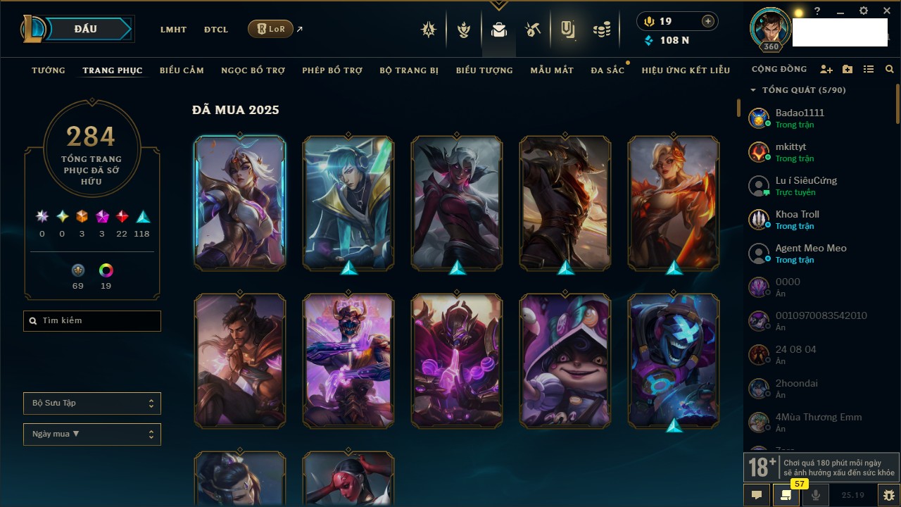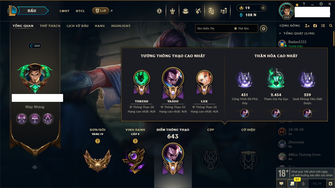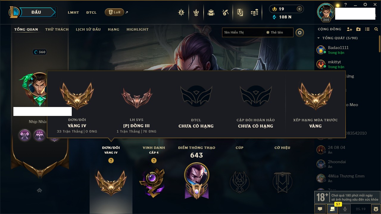 Rank Đơn: Vàng IKhung: BạcTướng: 171 - Còn 60584 THXTrang Phục: 286Rank ĐTCL: Vàng IIILinh Thú: 117