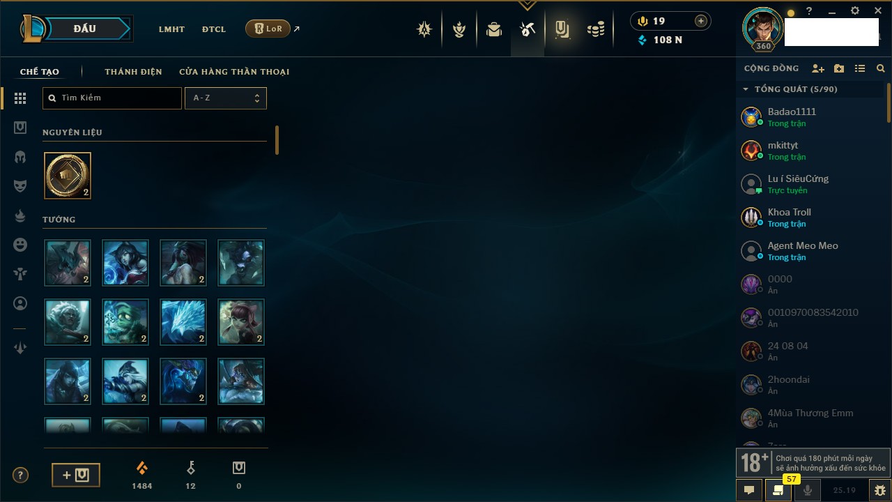 Rank Đơn: Vàng IVKhung: VàngTướng: 171 - Còn 660284 THXTrang Phục: 199Rank ĐTCL: Chưa RankLinh Thú: 34