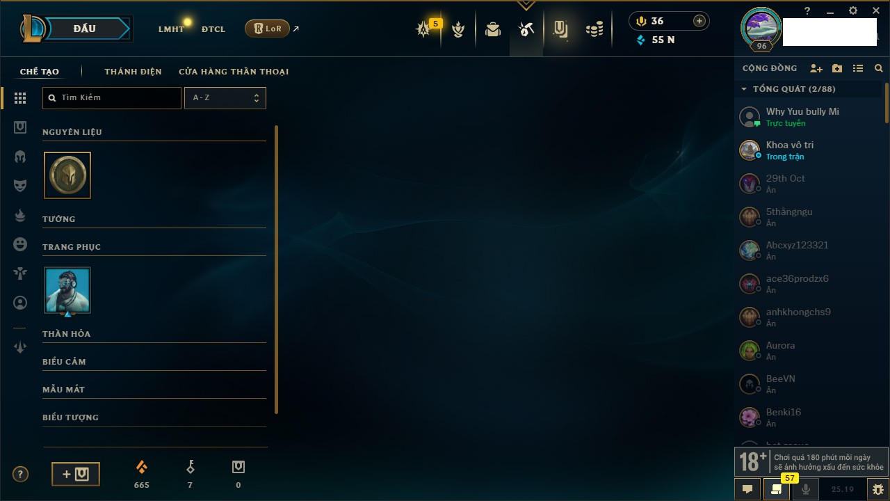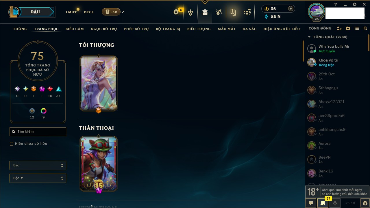 Rank Đơn: Vàng IIIKhung: VàngTướng: 171 - Còn 88128 THXTrang Phục: 329Rank ĐTCL: Chưa RankLinh Thú: 41