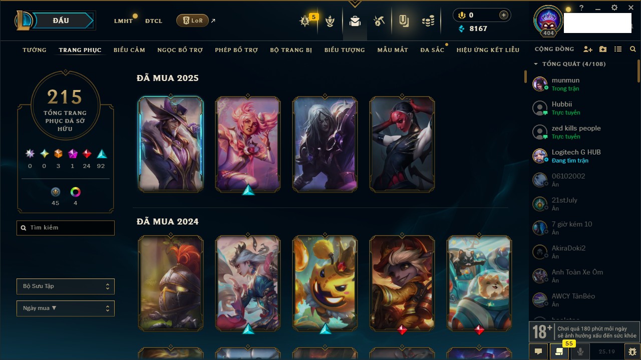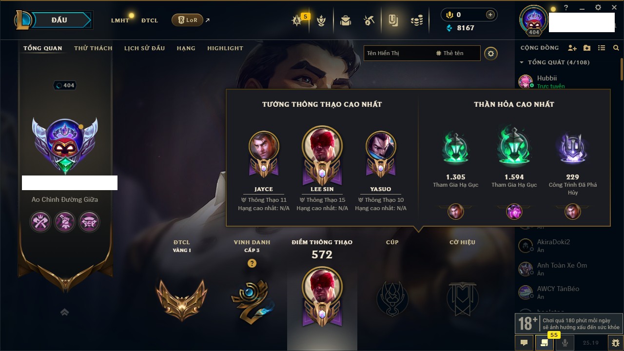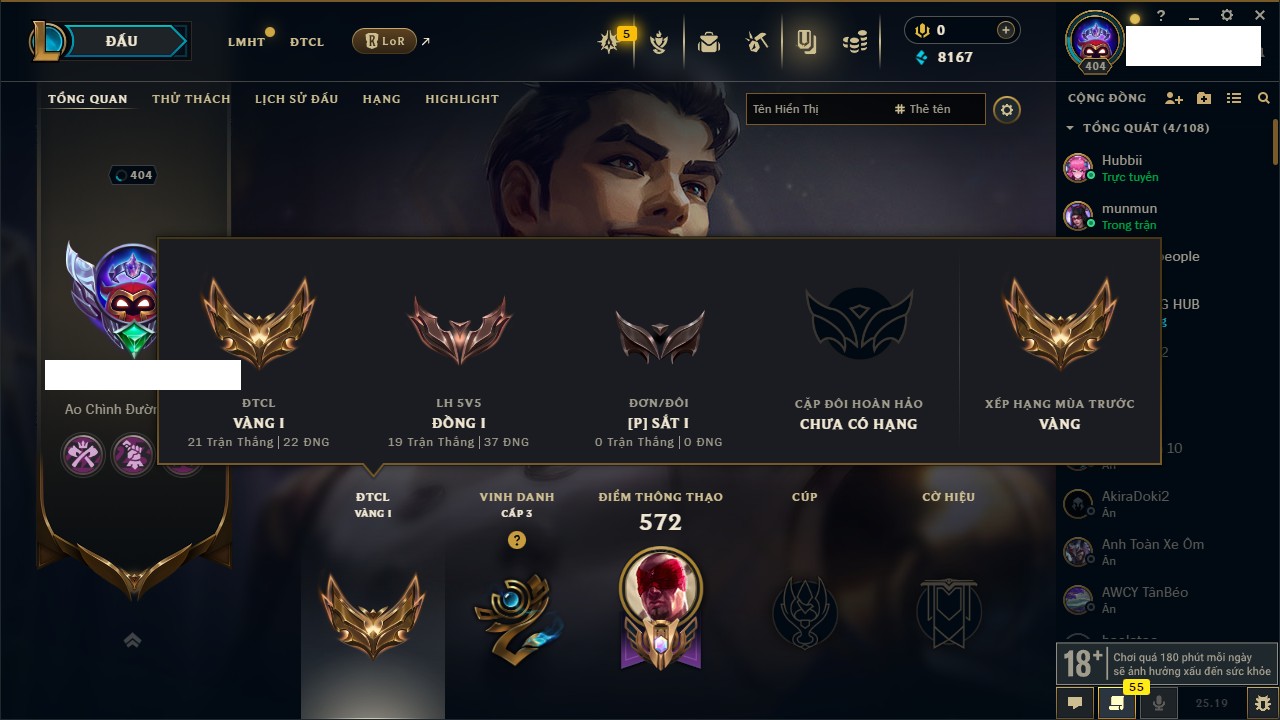 Rank Đơn: Vàng IKhung: Bạch kimTướng: 170 - Còn 212450 THXTrang Phục: 214Rank ĐTCL: Bạch Kim IVLinh Thú: 221