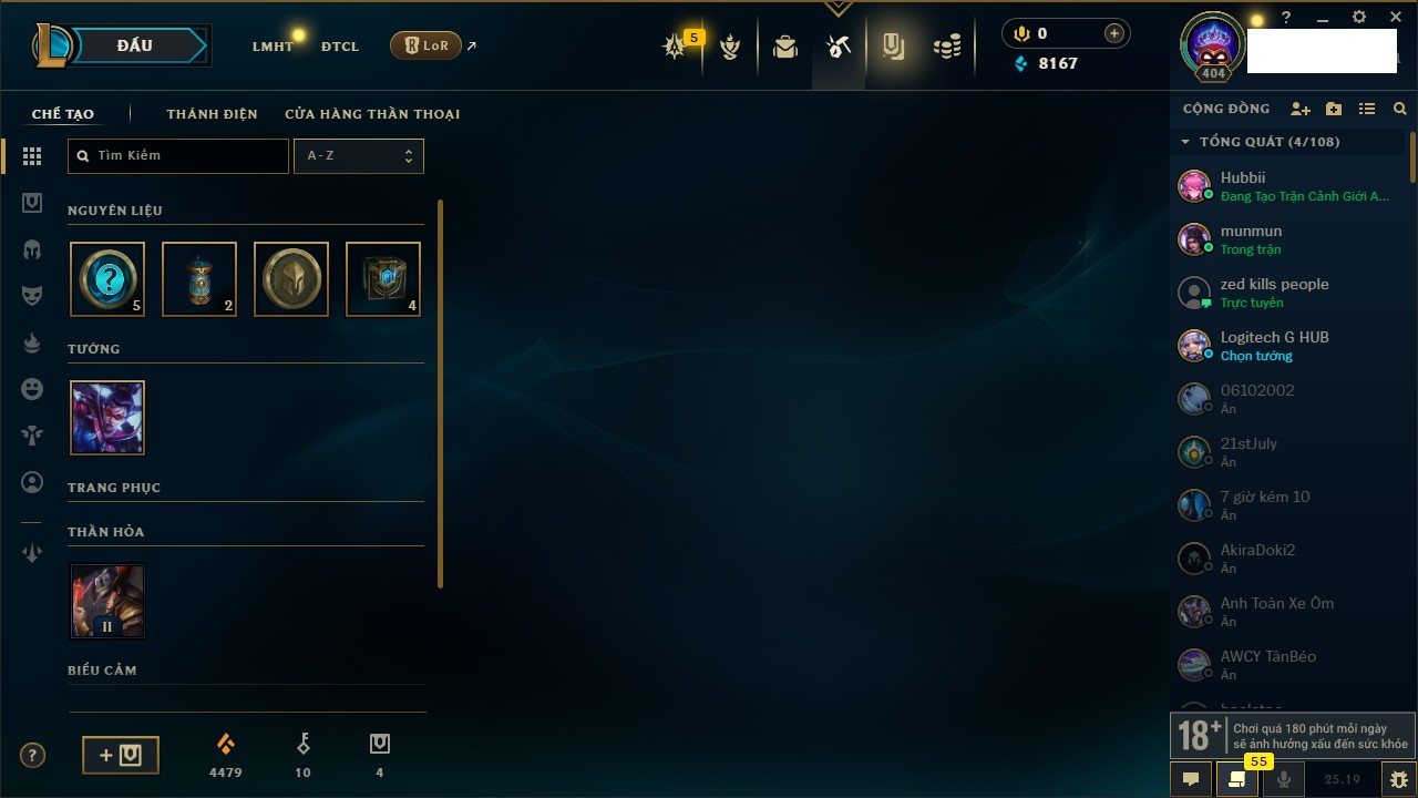 Rank Đơn: Bạch Kim IIIKhung: Bạch kimTướng: 170 - Còn 61079 THXTrang Phục: 352Rank ĐTCL: Sắt IILinh Thú: 70