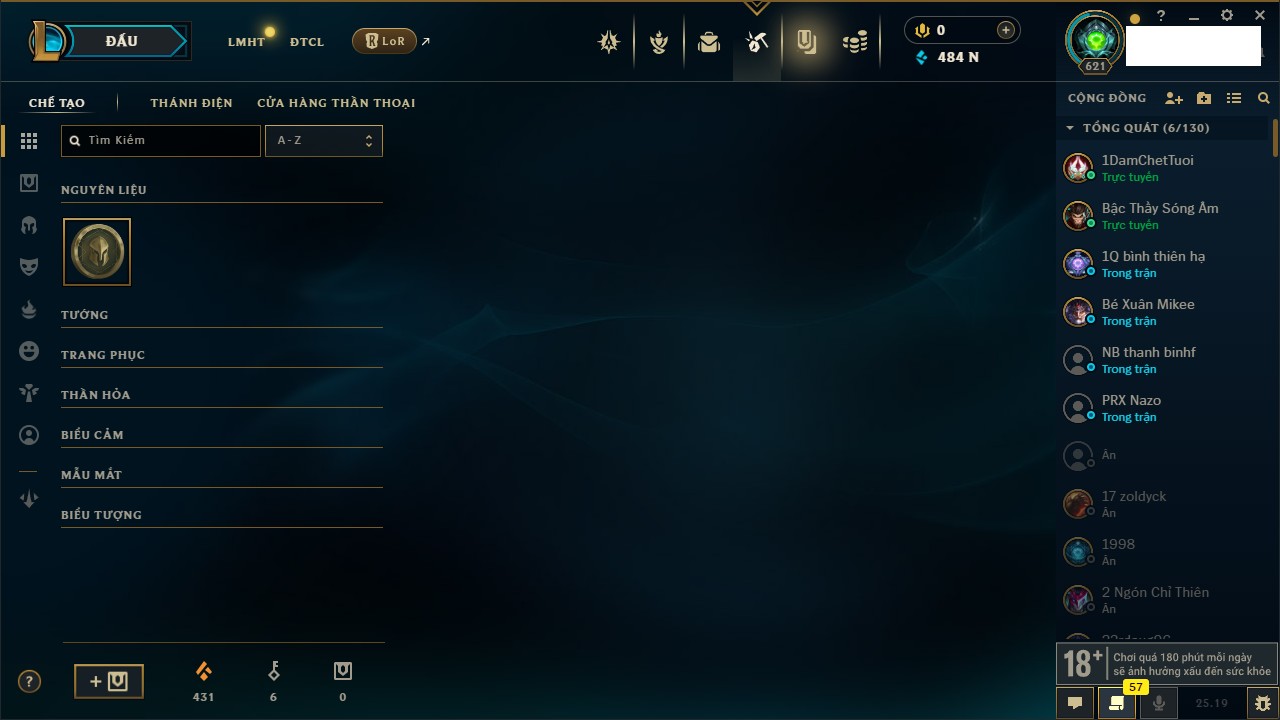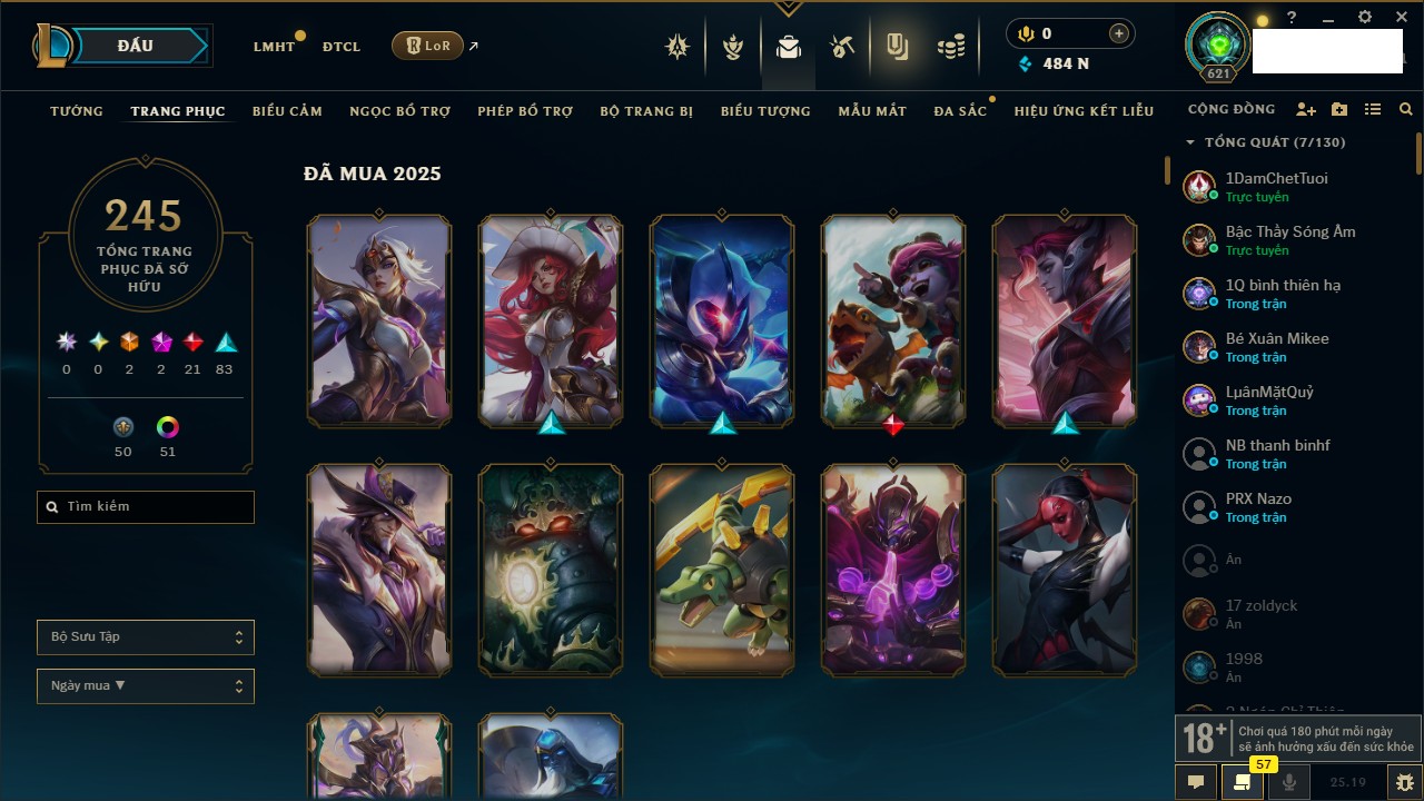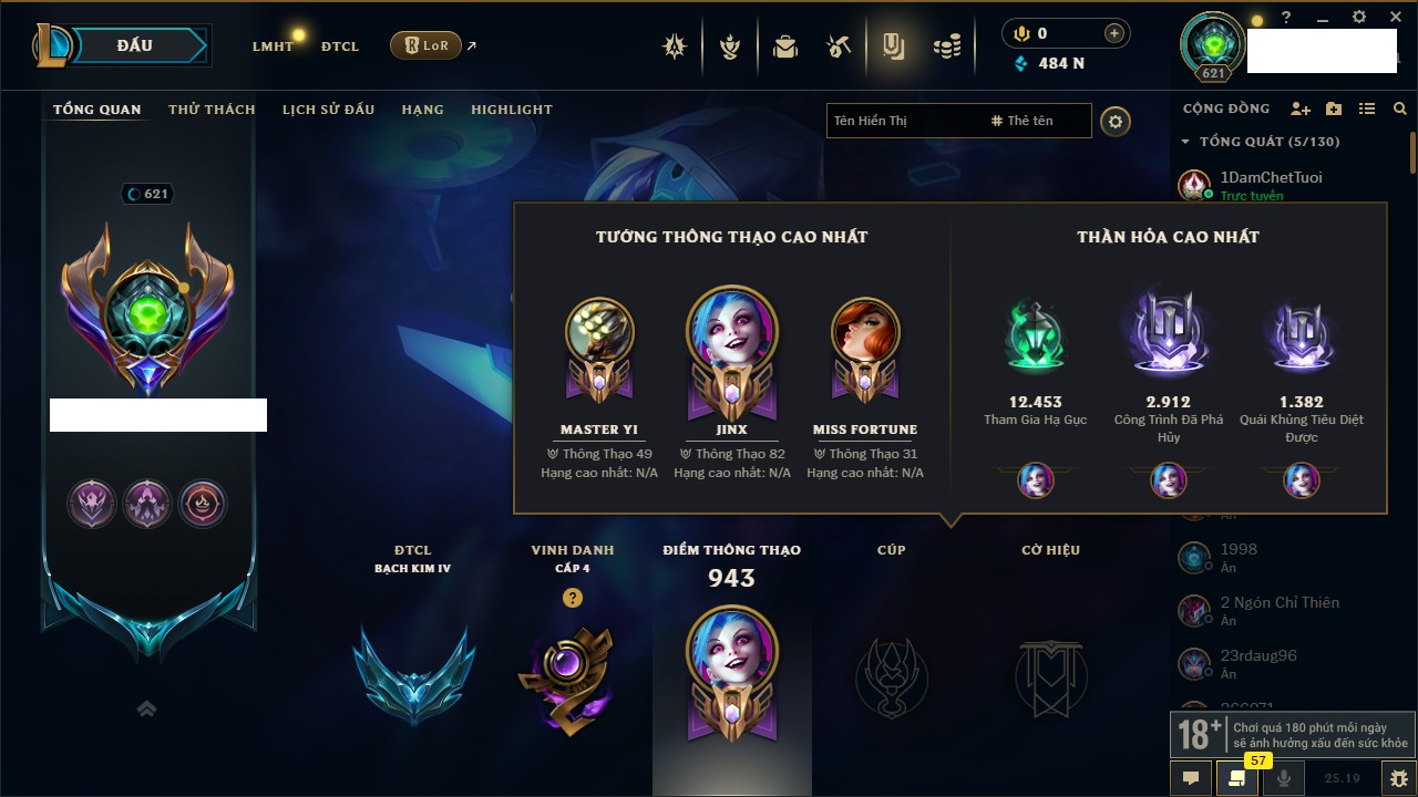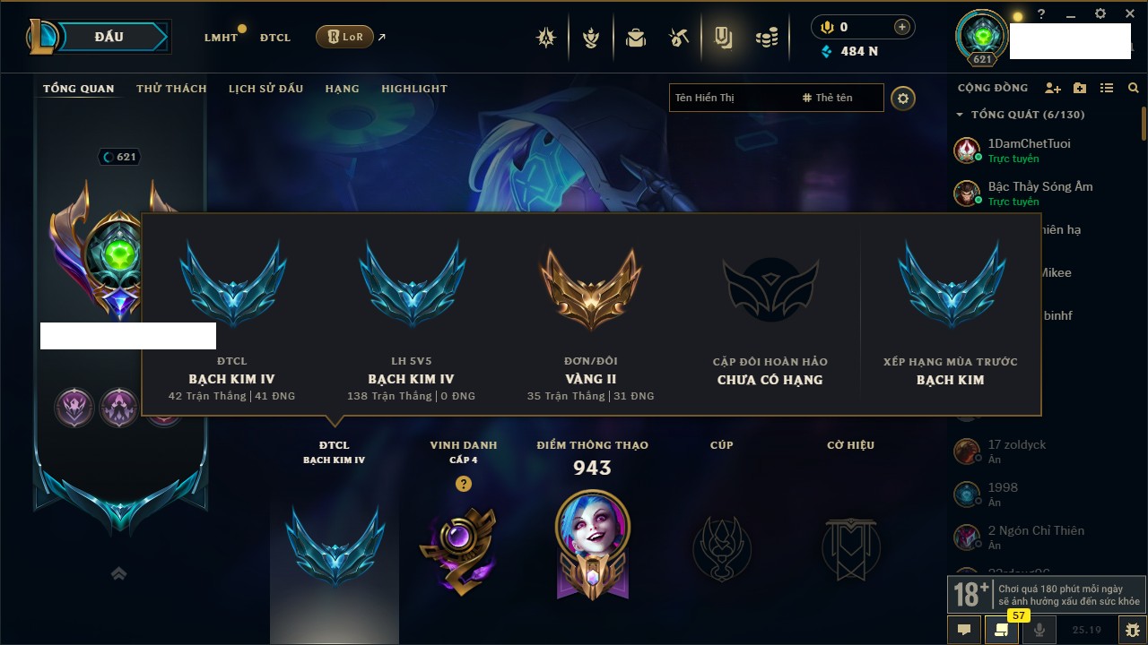 Rank Đơn: Bạc IIKhung: Bạch kimTướng: 169 - Còn 81813 THXTrang Phục: 301Rank ĐTCL: Chưa RankLinh Thú: 140