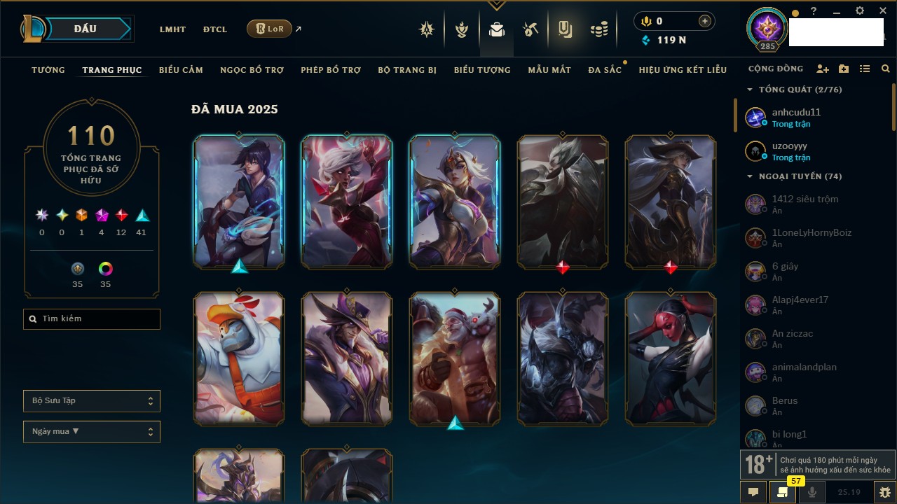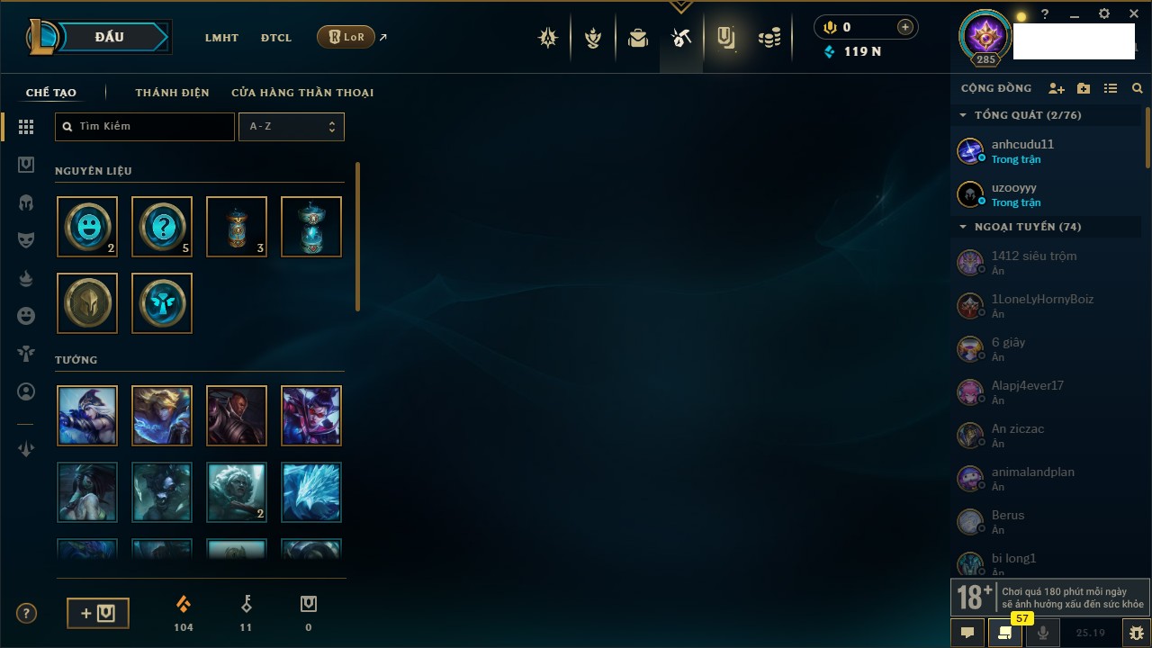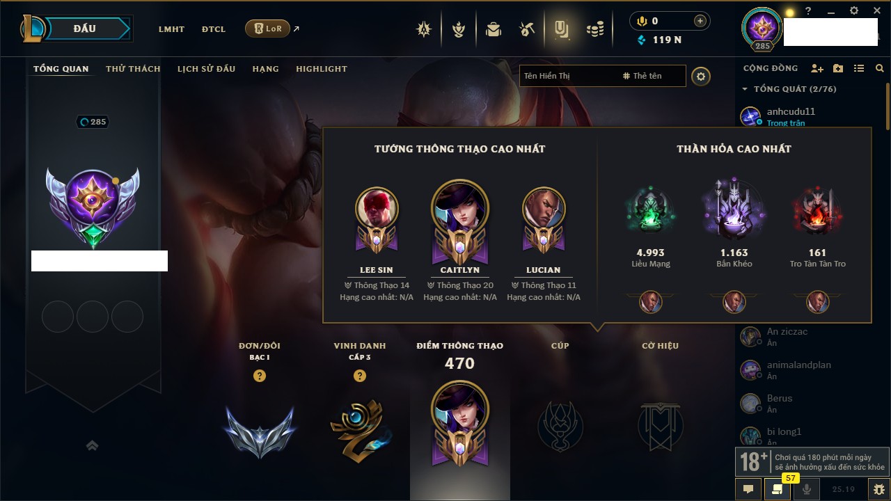 Rank Đơn: Bạc IVKhung: VàngTướng: 172 - Còn 358384 THXTrang Phục: 177Rank ĐTCL: Lục Bảo IILinh Thú: 211