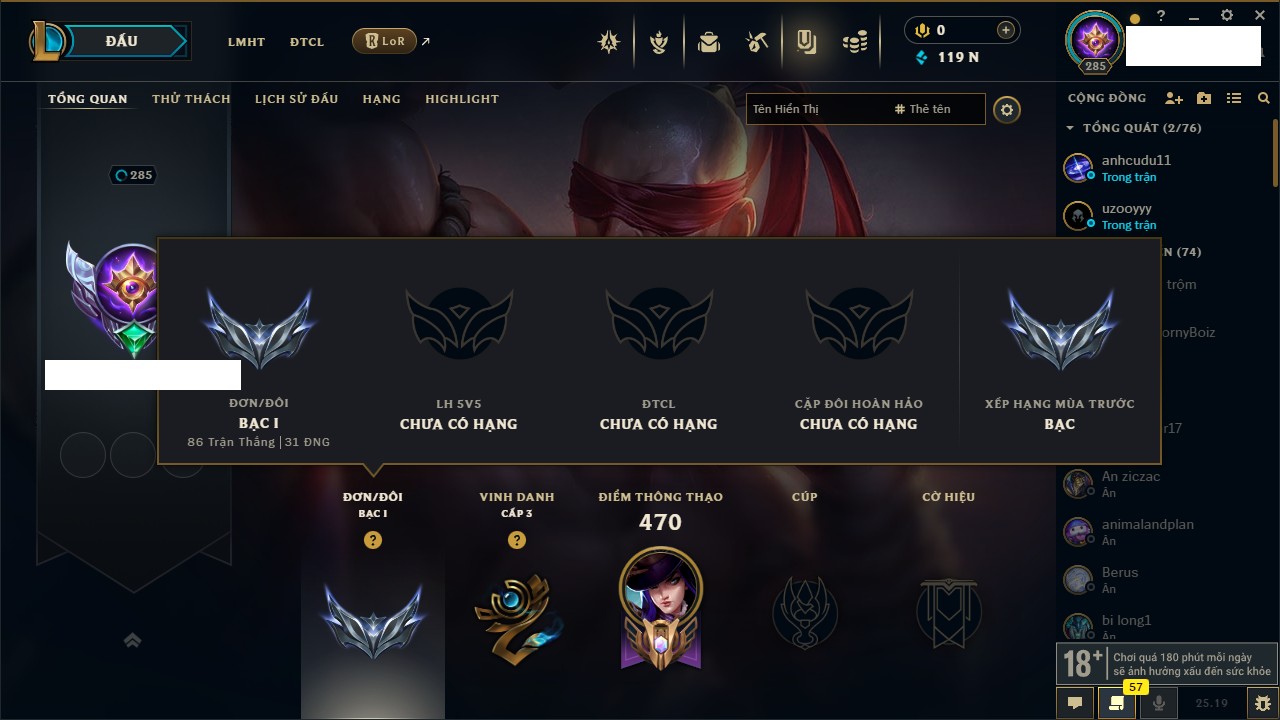 Rank Đơn: Bạc IIKhung: VàngTướng: 171 - Còn 332462 THXTrang Phục: 165Rank ĐTCL: Kim Cương IVLinh Thú: 181