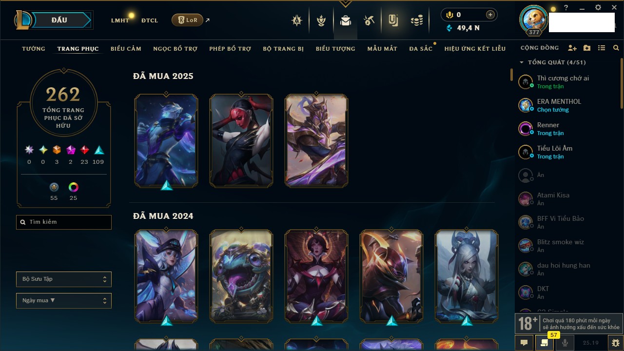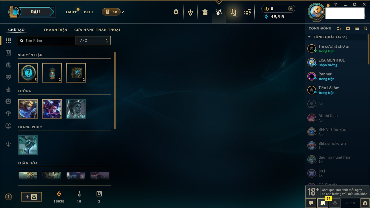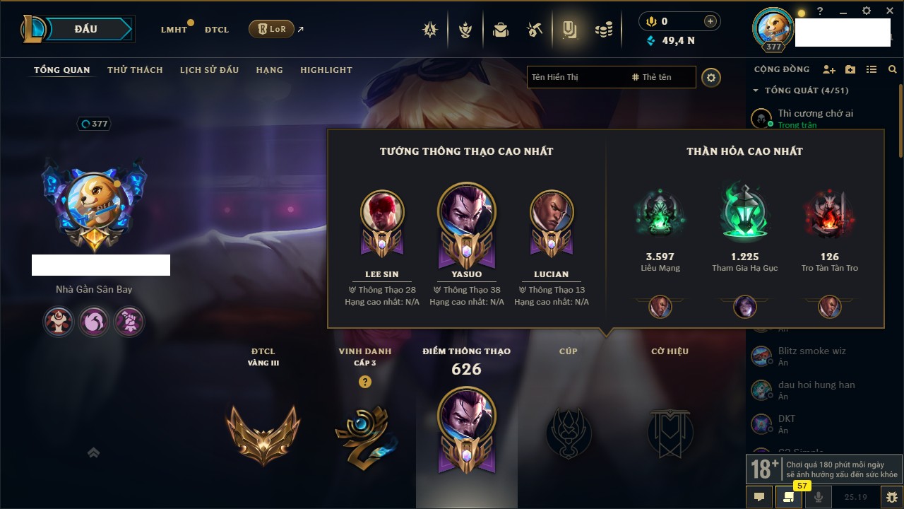 Rank Đơn: Bạch Kim IIKhung: Bạch kimTướng: 171 - Còn 316137 THXTrang Phục: 89Rank ĐTCL: Bạch Kim IIILinh Thú: 94