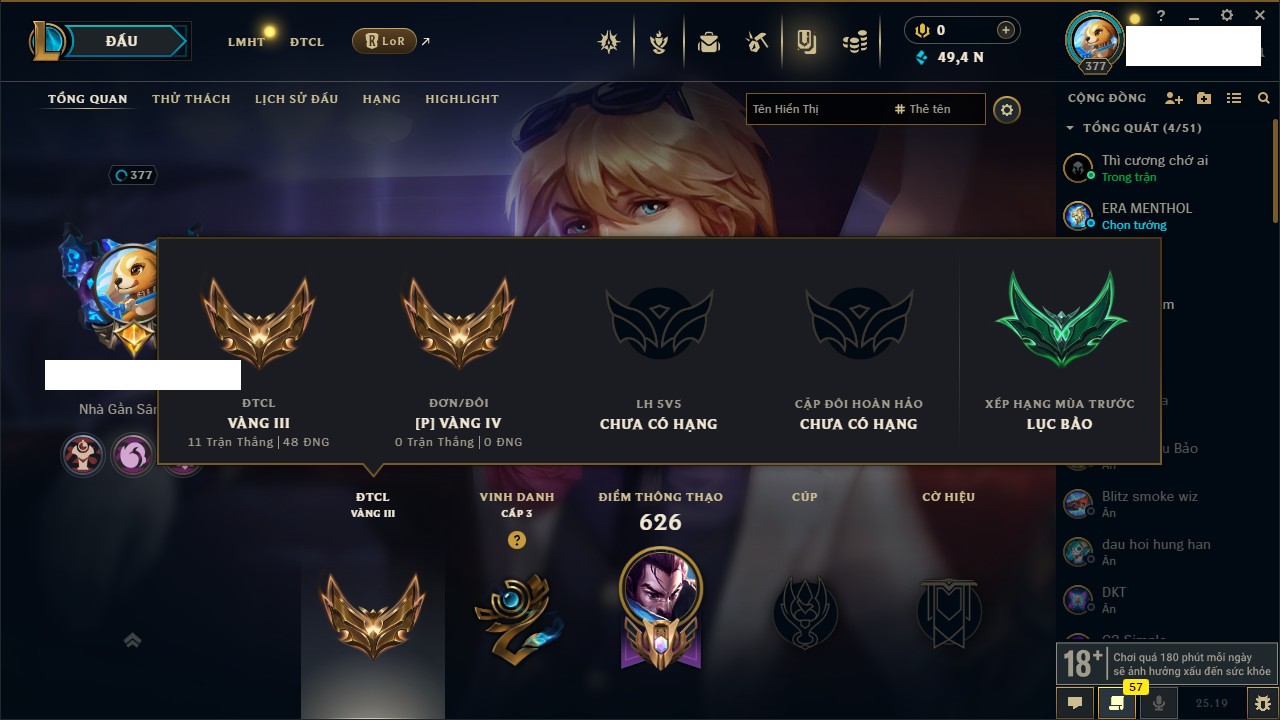 Rank Đơn: Lục Bảo IVKhung: VàngTướng: 171 - Còn 154648 THXTrang Phục: 203Rank ĐTCL: Bạch Kim IVLinh Thú: 69