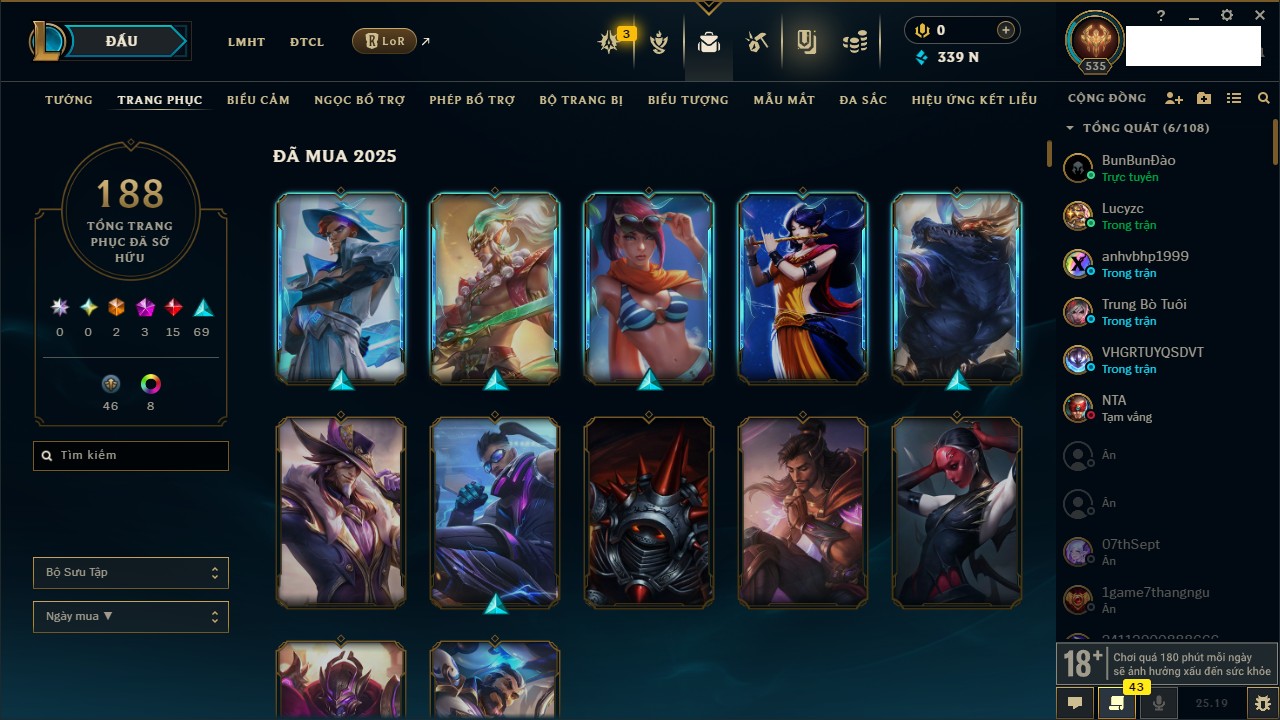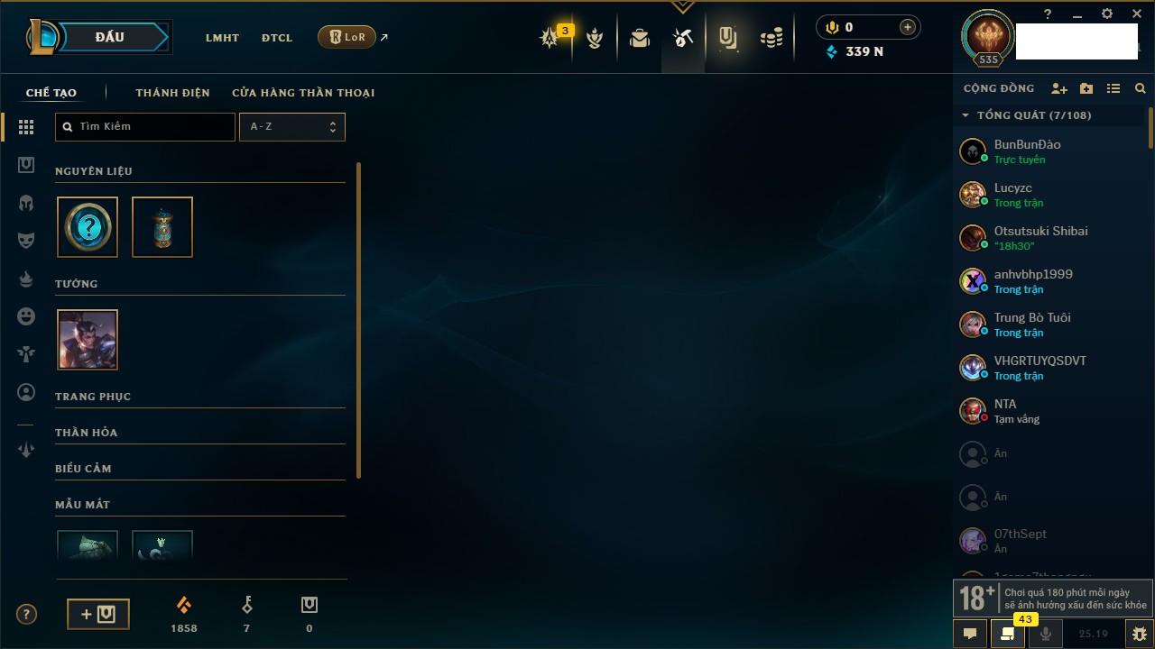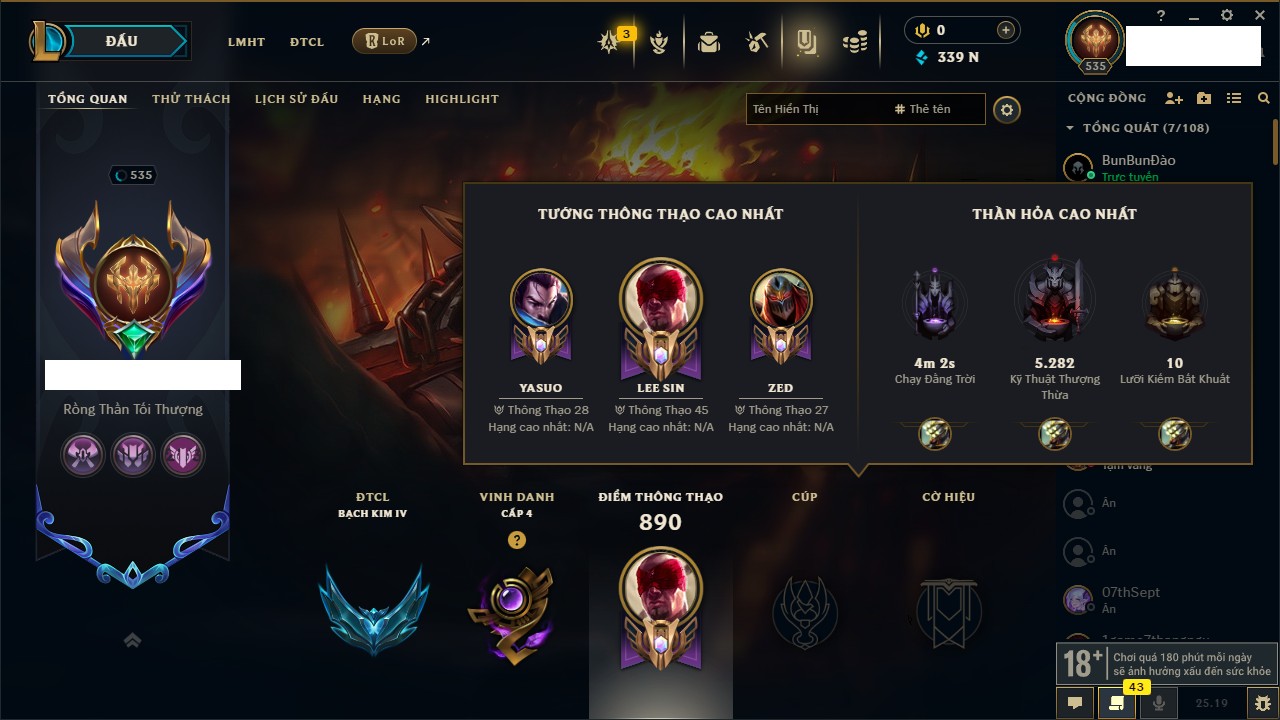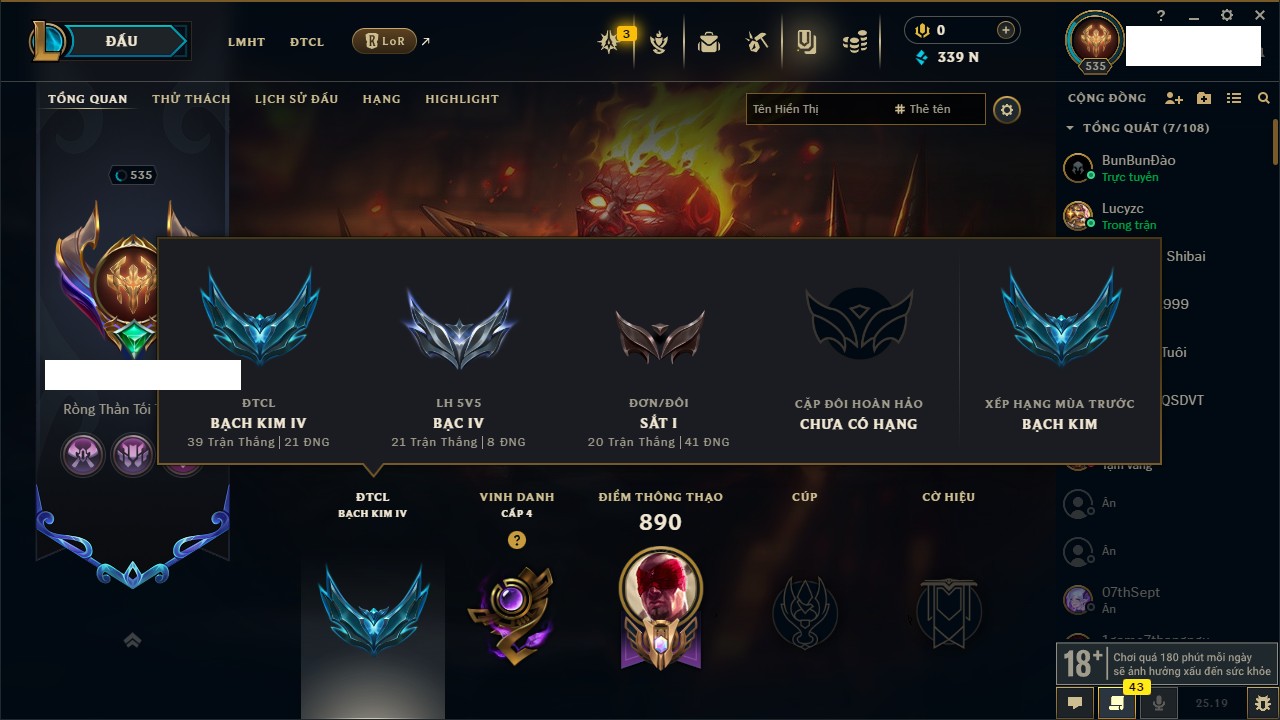 Rank Đơn: Bạch Kim IIKhung: Bạch kimTướng: 171 - Còn 316137 THXTrang Phục: 89Rank ĐTCL: Bạch Kim IIILinh Thú: 94