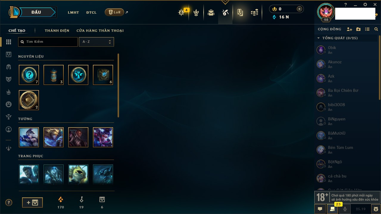Rank Đơn: Chưa RankKhung: Chưa có khungTướng: 169 - Còn 16087 THXTrang Phục: 65Rank ĐTCL: Vàng IILinh Thú: 131