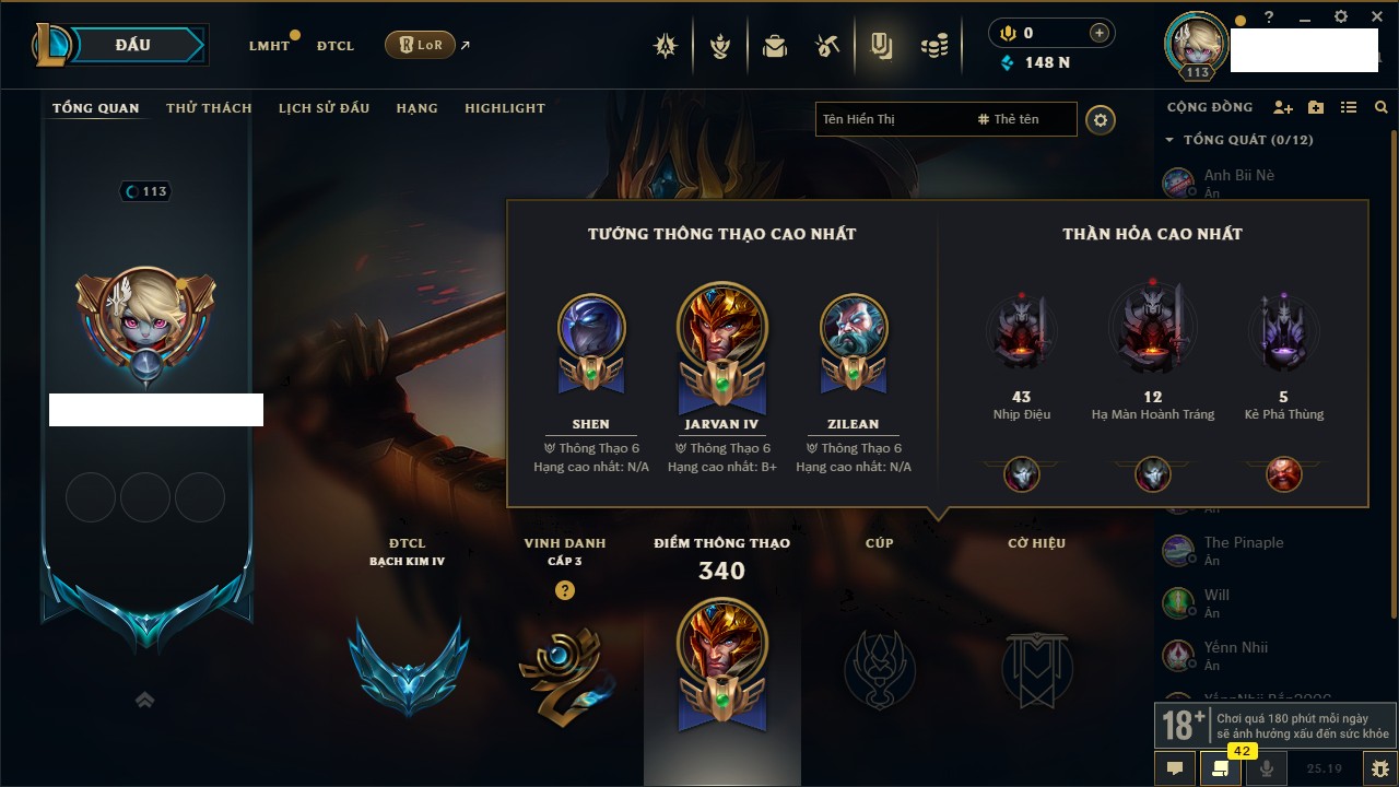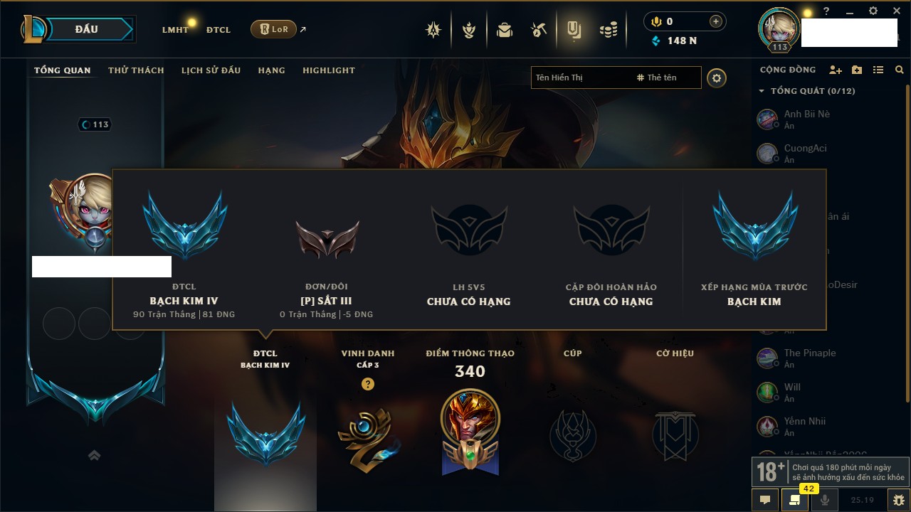 Rank Đơn: Bạch Kim IVKhung: VàngTướng: 171 - Còn 130578 THXTrang Phục: 253Rank ĐTCL: Chưa RankLinh Thú: 20