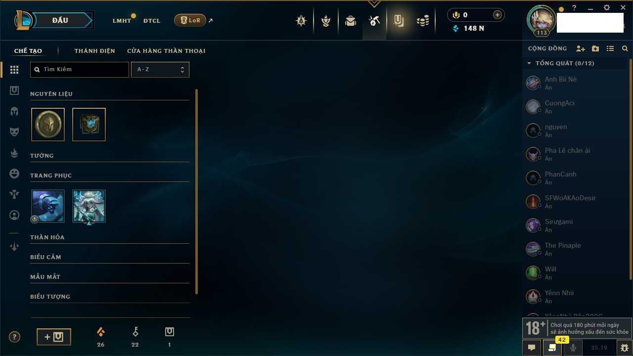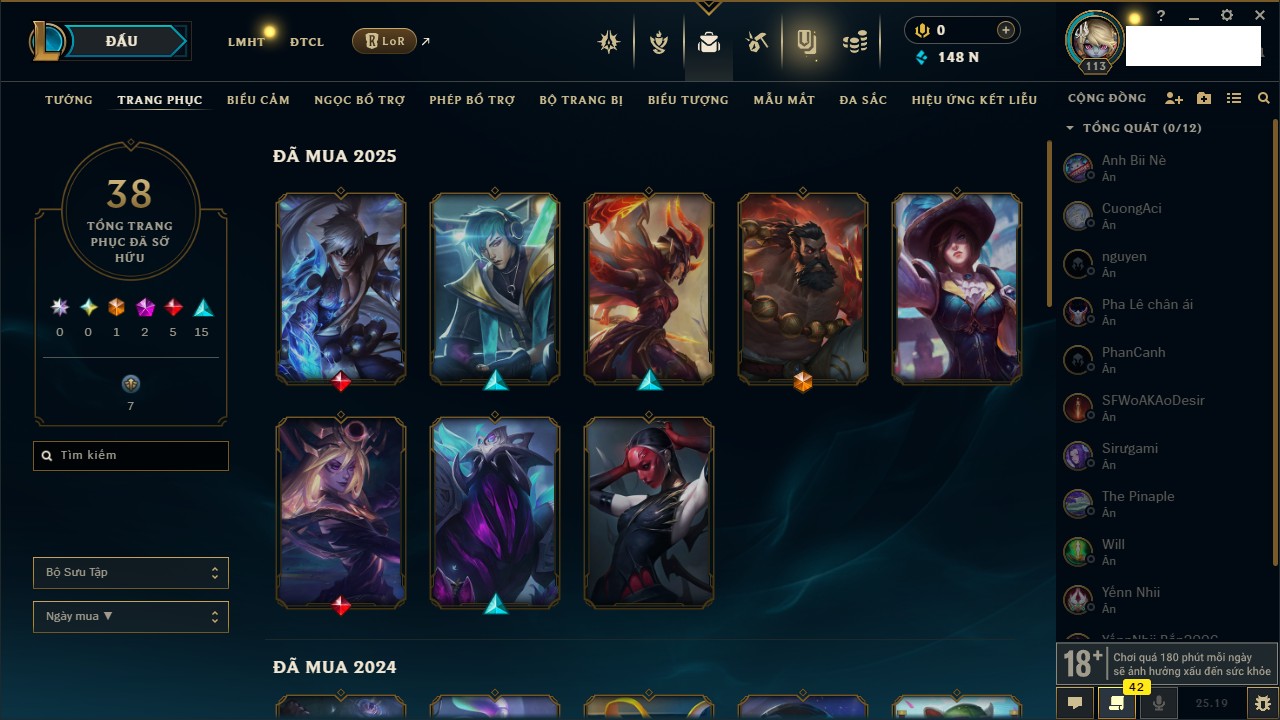 Rank Đơn: Vàng IIKhung: VàngTướng: 171 - Còn 219803 THXTrang Phục: 254Rank ĐTCL: Chưa RankLinh Thú: 78