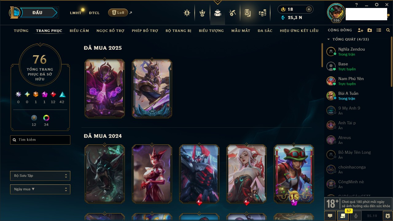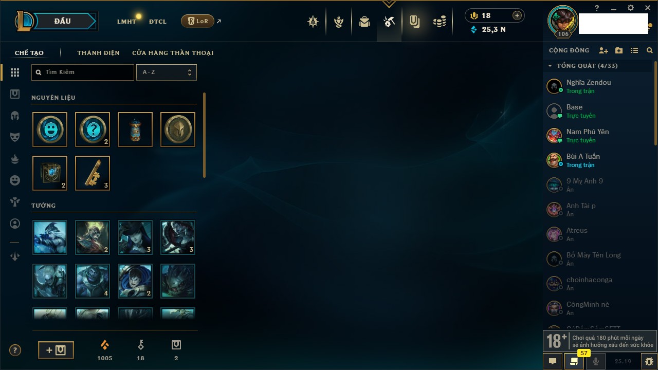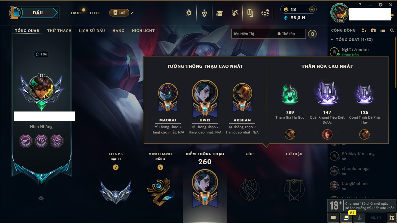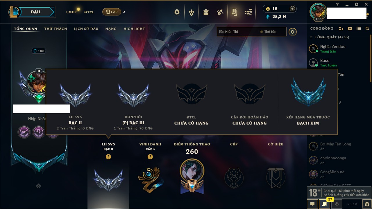 Rank Đơn: Vàng IIIKhung: BạcTướng: 171 - Còn 101359 THXTrang Phục: 88Rank ĐTCL: Kim Cương IVLinh Thú: 200