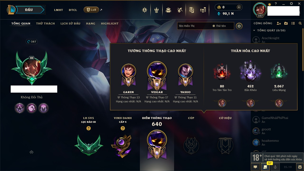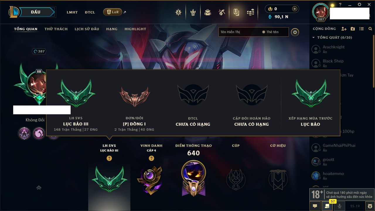 Rank Đơn: Đồng IIIKhung: ĐồngTướng: 170 - Còn 48082 THXTrang Phục: 272Rank ĐTCL: Chưa RankLinh Thú: 84