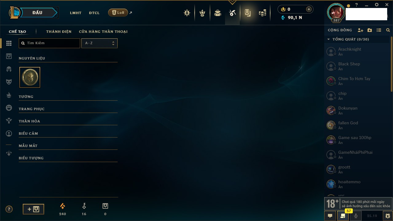 Rank Đơn: Bạch Kim IVKhung: Bạch kimTướng: 171 - Còn 182788 THXTrang Phục: 158Rank ĐTCL: Lục Bảo IVLinh Thú: 56