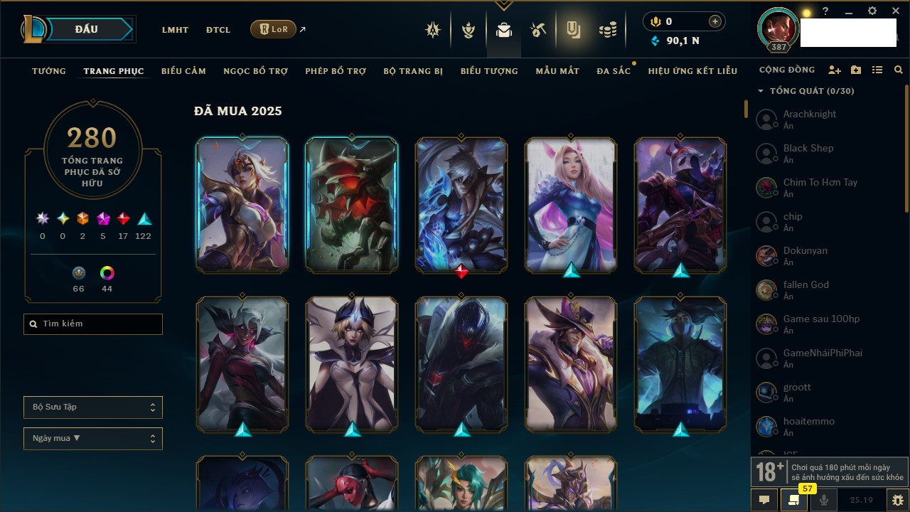 Rank Đơn: Vàng IKhung: Bạch kimTướng: 170 - Còn 212450 THXTrang Phục: 214Rank ĐTCL: Bạch Kim IVLinh Thú: 221